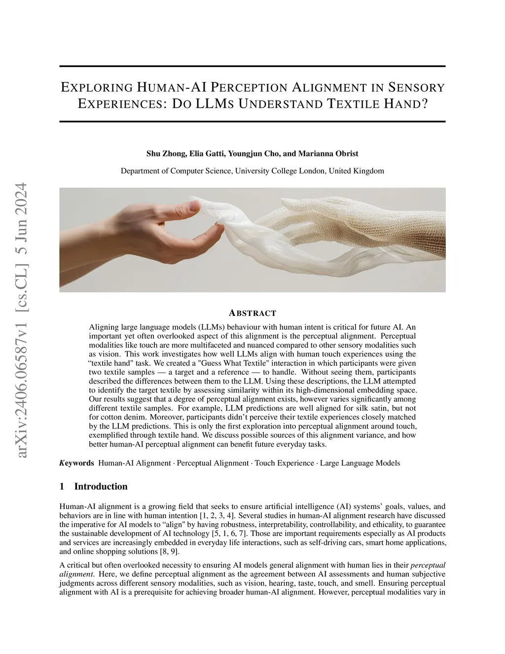 Aligning large language models (LLMs) behaviour with human intent is critical for future AI. An important yet often overlooked aspect of this alignment is the perceptual alignment. Perceptual modalities like touch are more multifaceted and nuanced compared to other sensory modalities such as vision. This work investigates how well LLMs align with human touch experiences using the "textile hand" task. We created a "Guess What Textile" interaction in which participants were given two textile samples -- a target and a reference -- to handle. Without seeing them, participants described the differences between them to the LLM. Using these descriptions, the LLM attempted to identify the target textile by assessing similarity within its high-dimensional embedding space. Our results suggest that a degree of perceptual alignment exists, however varies significantly among different textile samples. For example, LLM predictions are well aligned for silk satin, but not for cotton denim. Moreover, participants didn't perceive their textile experiences closely matched by the LLM predictions. This is only the first exploration into perceptual alignment around touch, exemplified through textile hand. We discuss possible sources of this alignment variance, and how better human-AI perceptual alignment can benefit future everyday tasks.