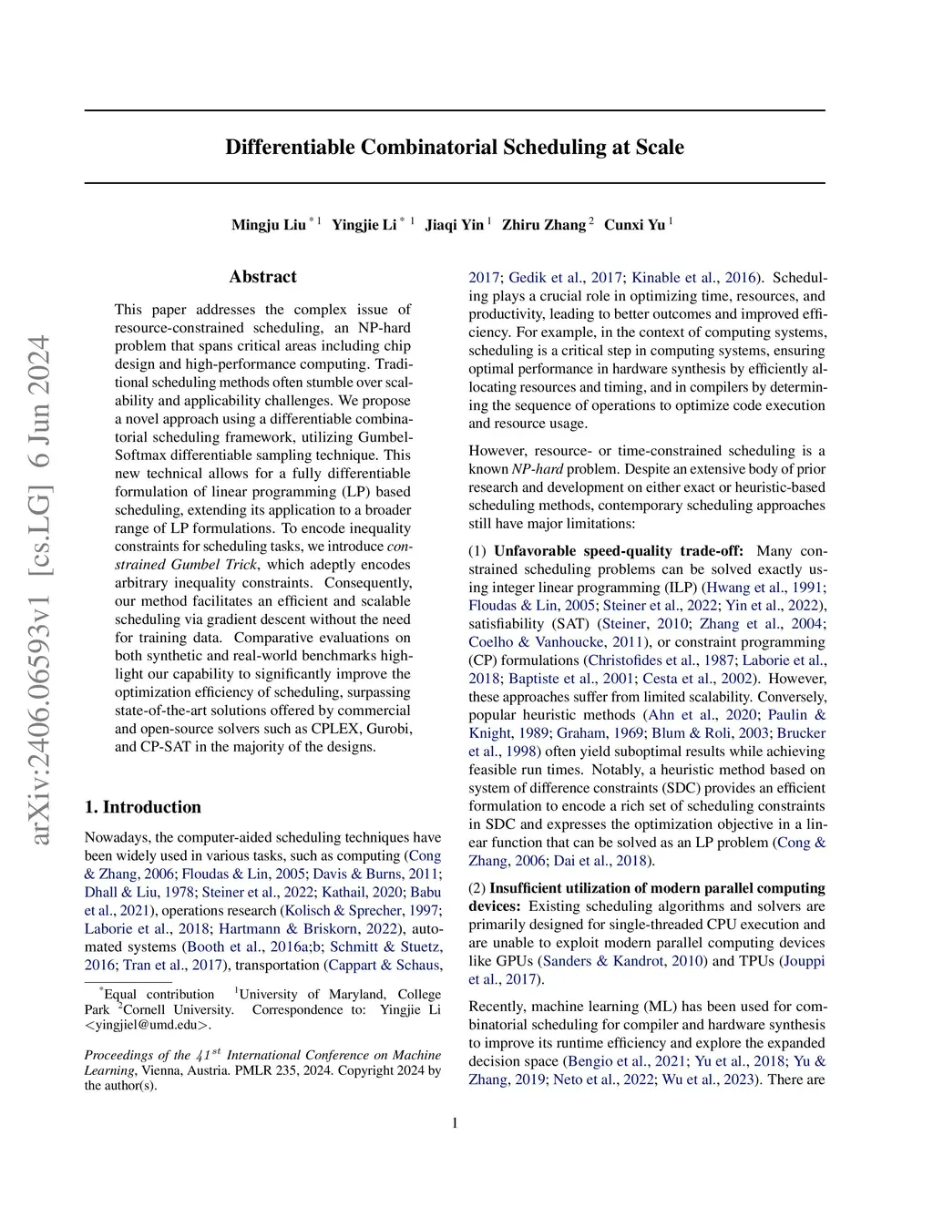 This paper addresses the complex issue of resource-constrained scheduling, an NP-hard problem that spans critical areas including chip design and high-performance computing. Traditional scheduling methods often stumble over scalability and applicability challenges. We propose a novel approach using a differentiable combinatorial scheduling framework, utilizing Gumbel-Softmax differentiable sampling technique. This new technical allows for a fully differentiable formulation of linear programming (LP) based scheduling, extending its application to a broader range of LP formulations. To encode inequality constraints for scheduling tasks, we introduce \textit{constrained Gumbel Trick}, which adeptly encodes arbitrary inequality constraints. Consequently, our method facilitates an efficient and scalable scheduling via gradient descent without the need for training data. Comparative evaluations on both synthetic and real-world benchmarks highlight our capability to significantly improve the optimization efficiency of scheduling, surpassing state-of-the-art solutions offered by commercial and open-source solvers such as CPLEX, Gurobi, and CP-SAT in the majority of the designs.