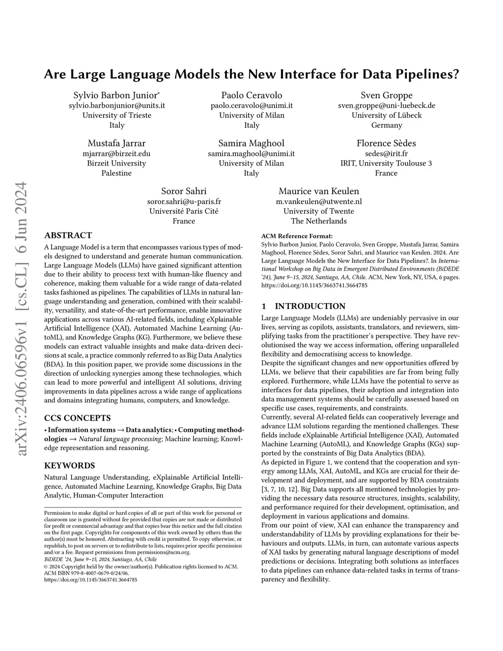 A Language Model is a term that encompasses various types of models designed to understand and generate human communication. Large Language Models (LLMs) have gained significant attention due to their ability to process text with human-like fluency and coherence, making them valuable for a wide range of data-related tasks fashioned as pipelines. The capabilities of LLMs in natural language understanding and generation, combined with their scalability, versatility, and state-of-the-art performance, enable innovative applications across various AI-related fields, including eXplainable Artificial Intelligence (XAI), Automated Machine Learning (AutoML), and Knowledge Graphs (KG). Furthermore, we believe these models can extract valuable insights and make data-driven decisions at scale, a practice commonly referred to as Big Data Analytics (BDA). In this position paper, we provide some discussions in the direction of unlocking synergies among these technologies, which can lead to more powerful and intelligent AI solutions, driving improvements in data pipelines across a wide range of applications and domains integrating humans, computers, and knowledge.