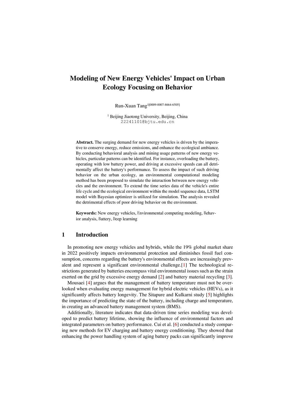 The surging demand for new energy vehicles is driven by the imperative to conserve energy, reduce emissions, and enhance the ecological ambiance. By conducting behavioral analysis and mining usage patterns of new energy vehicles, particular patterns can be identified. For instance, overloading the battery, operating with low battery power, and driving at excessive speeds can all detrimentally affect the battery's performance. To assess the impact of such driving behavior on the urban ecology, an environmental computational modeling method has been proposed to simulate the interaction between new energy vehicles and the environment. To extend the time series data of the vehicle's entire life cycle and the ecological environment within the model sequence data, the LSTM model with Bayesian optimizer is utilized for simulation. The analysis revealed the detrimental effects of poor driving behavior on the environment.