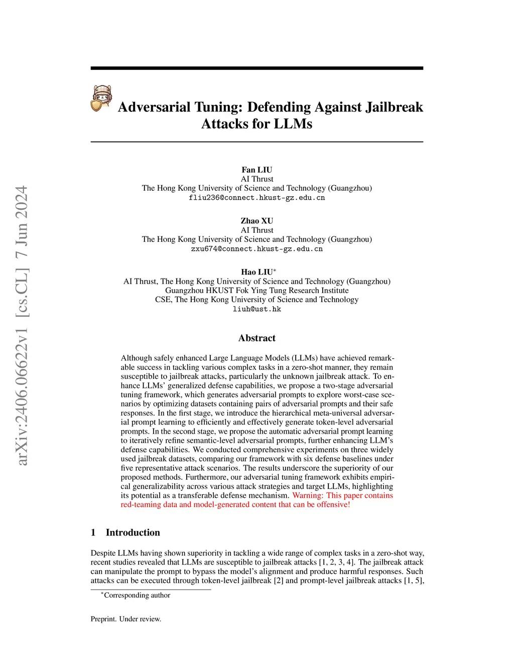 Adversarial Tuning: Defending Against Jailbreak Attacks for LLMs