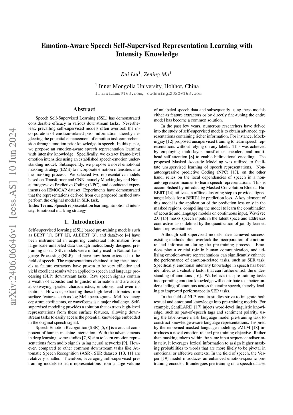Speech Self-Supervised Learning (SSL) has demonstrated considerable efficacy in various downstream tasks. Nevertheless, prevailing self-supervised models often overlook the incorporation of emotion-related prior information, thereby neglecting the potential enhancement of emotion task comprehension through emotion prior knowledge in speech. In this paper, we propose an emotion-aware speech representation learning with intensity knowledge. Specifically, we extract frame-level emotion intensities using an established speech-emotion understanding model. Subsequently, we propose a novel emotional masking strategy (EMS) to incorporate emotion intensities into the masking process. We selected two representative models based on Transformer and CNN, namely MockingJay and Non-autoregressive Predictive Coding (NPC), and conducted experiments on IEMOCAP dataset. Experiments have demonstrated that the representations derived from our proposed method outperform the original model in SER task.