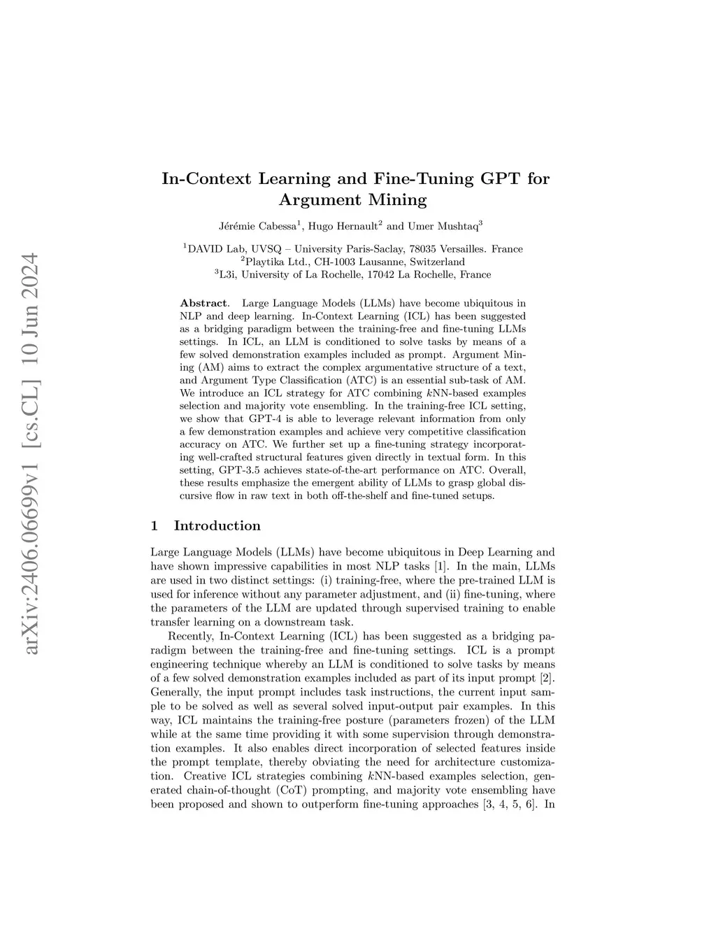 Large Language Models (LLMs) have become ubiquitous in NLP and deep learning. In-Context Learning (ICL) has been suggested as a bridging paradigm between the training-free and fine-tuning LLMs settings. In ICL, an LLM is conditioned to solve tasks by means of a few solved demonstration examples included as prompt. Argument Mining (AM) aims to extract the complex argumentative structure of a text, and Argument Type Classification (ATC) is an essential sub-task of AM. We introduce an ICL strategy for ATC combining kNN-based examples selection and majority vote ensembling. In the training-free ICL setting, we show that GPT-4 is able to leverage relevant information from only a few demonstration examples and achieve very competitive classification accuracy on ATC. We further set up a fine-tuning strategy incorporating well-crafted structural features given directly in textual form. In this setting, GPT-3.5 achieves state-of-the-art performance on ATC. Overall, these results emphasize the emergent ability of LLMs to grasp global discursive flow in raw text in both off-the-shelf and fine-tuned setups.