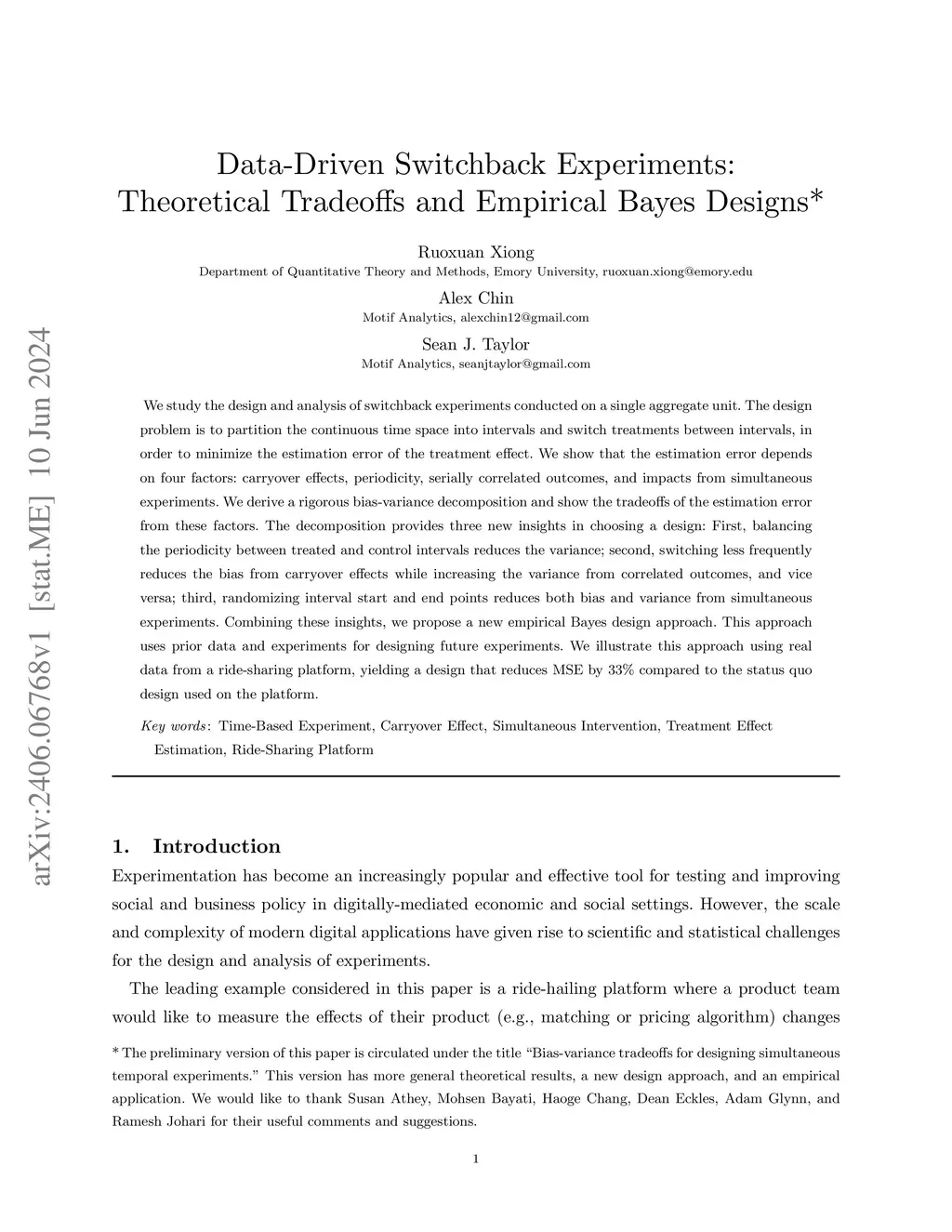 We study the design and analysis of switchback experiments conducted on a single aggregate unit. The design problem is to partition the continuous time space into intervals and switch treatments between intervals, in order to minimize the estimation error of the treatment effect. We show that the estimation error depends on four factors: carryover effects, periodicity, serially correlated outcomes, and impacts from simultaneous experiments. We derive a rigorous bias-variance decomposition and show the tradeoffs of the estimation error from these factors. The decomposition provides three new insights in choosing a design: First, balancing the periodicity between treated and control intervals reduces the variance; second, switching less frequently reduces the bias from carryover effects while increasing the variance from correlated outcomes, and vice versa; third, randomizing interval start and end points reduces both bias and variance from simultaneous experiments. Combining these insights, we propose a new empirical Bayes design approach. This approach uses prior data and experiments for designing future experiments. We illustrate this approach using real data from a ride-sharing platform, yielding a design that reduces MSE by 33% compared to the status quo design used on the platform.
