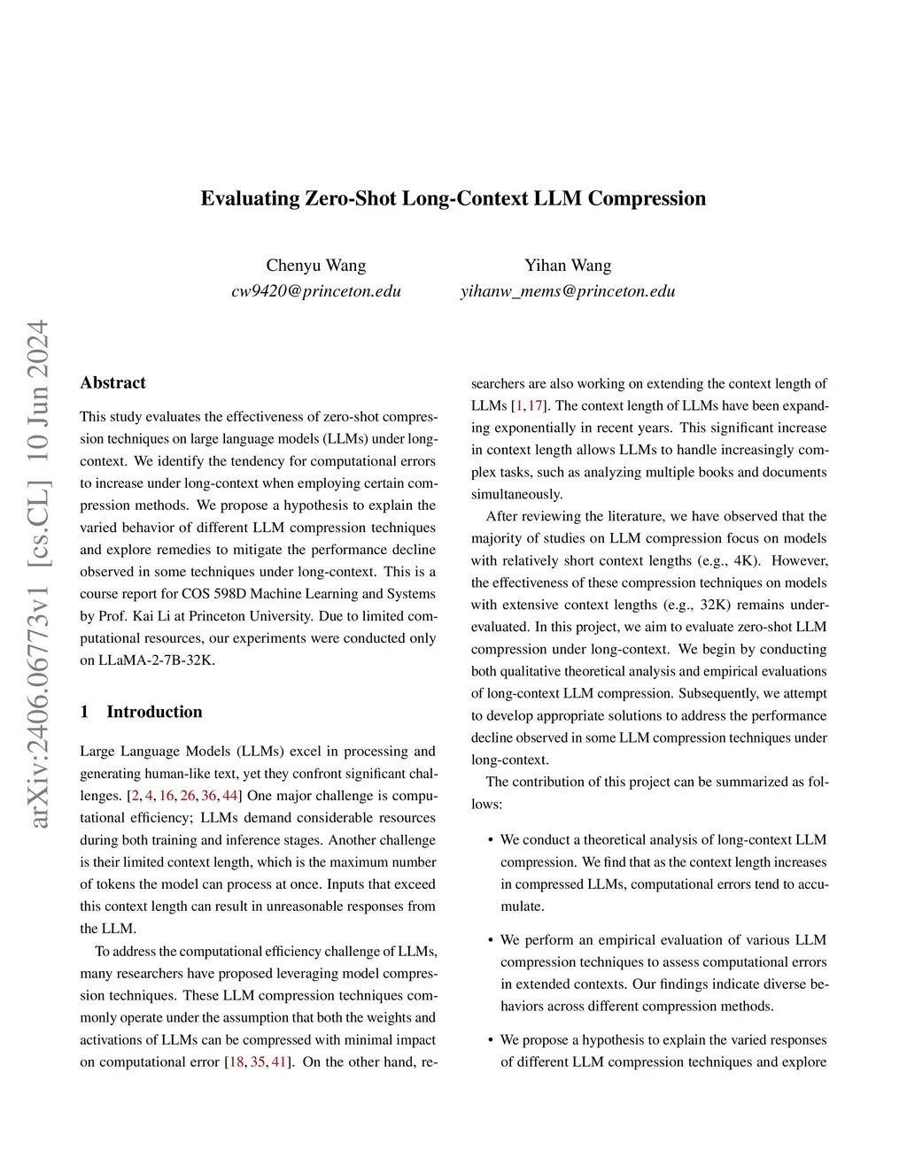 This study evaluates the effectiveness of zero-shot compression techniques on large language models (LLMs) under long-context. We identify the tendency for computational errors to increase under long-context when employing certain compression methods. We propose a hypothesis to explain the varied behavior of different LLM compression techniques and explore remedies to mitigate the performance decline observed in some techniques under long-context. This is a course report for COS 598D Machine Learning and Systems by Prof. Kai Li at Princeton University. Due to limited computational resources, our experiments were conducted only on LLaMA-2-7B-32K.