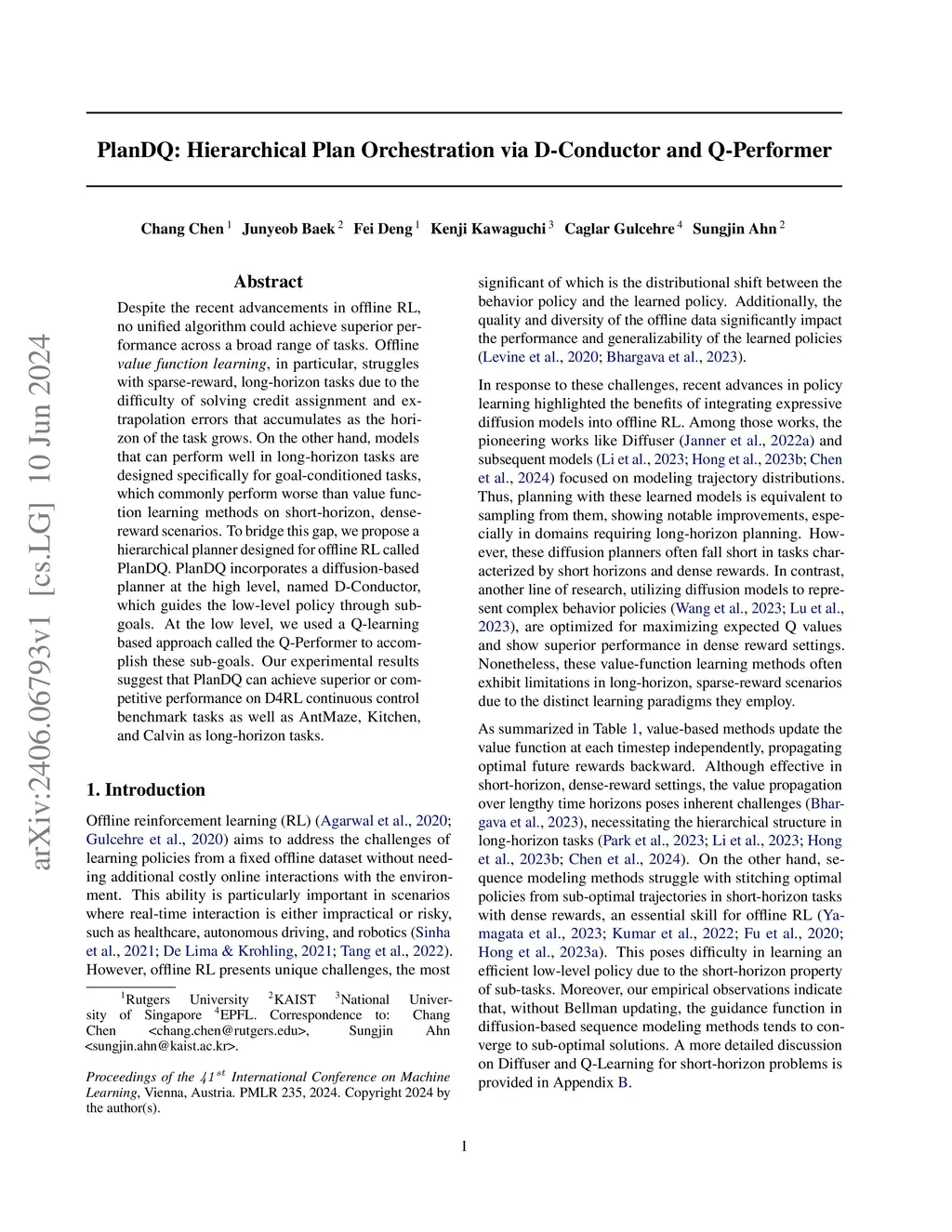 Despite the recent advancements in offline RL, no unified algorithm could achieve superior performance across a broad range of tasks. Offline \textit{value function learning}, in particular, struggles with sparse-reward, long-horizon tasks due to the difficulty of solving credit assignment and extrapolation errors that accumulates as the horizon of the task grows.~On the other hand, models that can perform well in long-horizon tasks are designed specifically for goal-conditioned tasks, which commonly perform worse than value function learning methods on short-horizon, dense-reward scenarios. To bridge this gap, we propose a hierarchical planner designed for offline RL called PlanDQ. PlanDQ incorporates a diffusion-based planner at the high level, named D-Conductor, which guides the low-level policy through sub-goals. At the low level, we used a Q-learning based approach called the Q-Performer to accomplish these sub-goals. Our experimental results suggest that PlanDQ can achieve superior or competitive performance on D4RL continuous control benchmark tasks as well as AntMaze, Kitchen, and Calvin as long-horizon tasks.