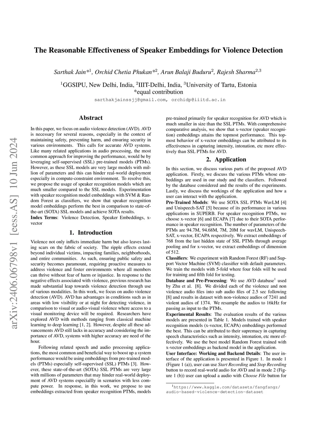 In this paper, we focus on audio violence detection (AVD). AVD is necessary for several reasons, especially in the context of maintaining safety, preventing harm, and ensuring security in various environments. This calls for accurate AVD systems. Like many related applications in audio processing, the most common approach for improving the performance, would be by leveraging self-supervised (SSL) pre-trained models (PTMs). However, as these SSL models are very large models with million of parameters and this can hinder real-world deployment especially in compute-constraint environment. To resolve this, we propose the usage of speaker recognition models which are much smaller compared to the SSL models. Experimentation with speaker recognition model embeddings with SVM & Random Forest as classifiers, we show that speaker recognition model embeddings perform the best in comparison to state-of-the-art (SOTA) SSL models and achieve SOTA results.