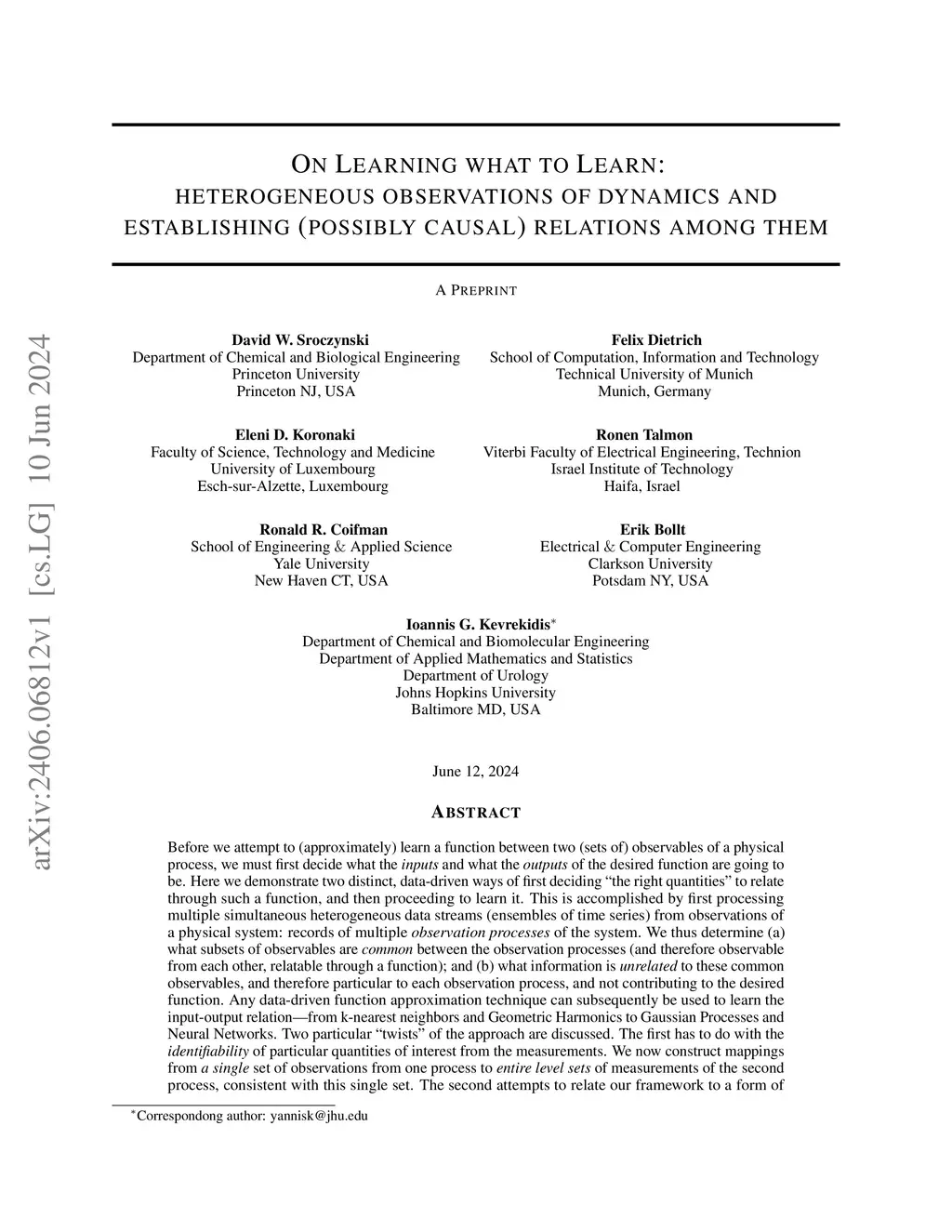 Before we attempt to learn a function between two (sets of) observables of a physical process, we must first decide what the inputs and what the outputs of the desired function are going to be. Here we demonstrate two distinct, data-driven ways of initially deciding ``the right quantities'' to relate through such a function, and then proceed to learn it. This is accomplished by processing multiple simultaneous heterogeneous data streams (ensembles of time series) from observations of a physical system: multiple observation processes of the system. We thus determine (a) what subsets of observables are common between the observation processes (and therefore observable from each other, relatable through a function); and (b) what information is unrelated to these common observables, and therefore particular to each observation process, and not contributing to the desired function. Any data-driven function approximation technique can subsequently be used to learn the input-output relation, from k-nearest neighbors and Geometric Harmonics to Gaussian Processes and Neural Networks. Two particular ``twists'' of the approach are discussed. The first has to do with the identifiability of particular quantities of interest from the measurements. We now construct mappings from a single set of observations of one process to entire level sets of measurements of the process, consistent with this single set. The second attempts to relate our framework to a form of causality: if one of the observation processes measures ``now'', while the second observation process measures ``in the future'', the function to be learned among what is common across observation processes constitutes a dynamical model for the system evolution.