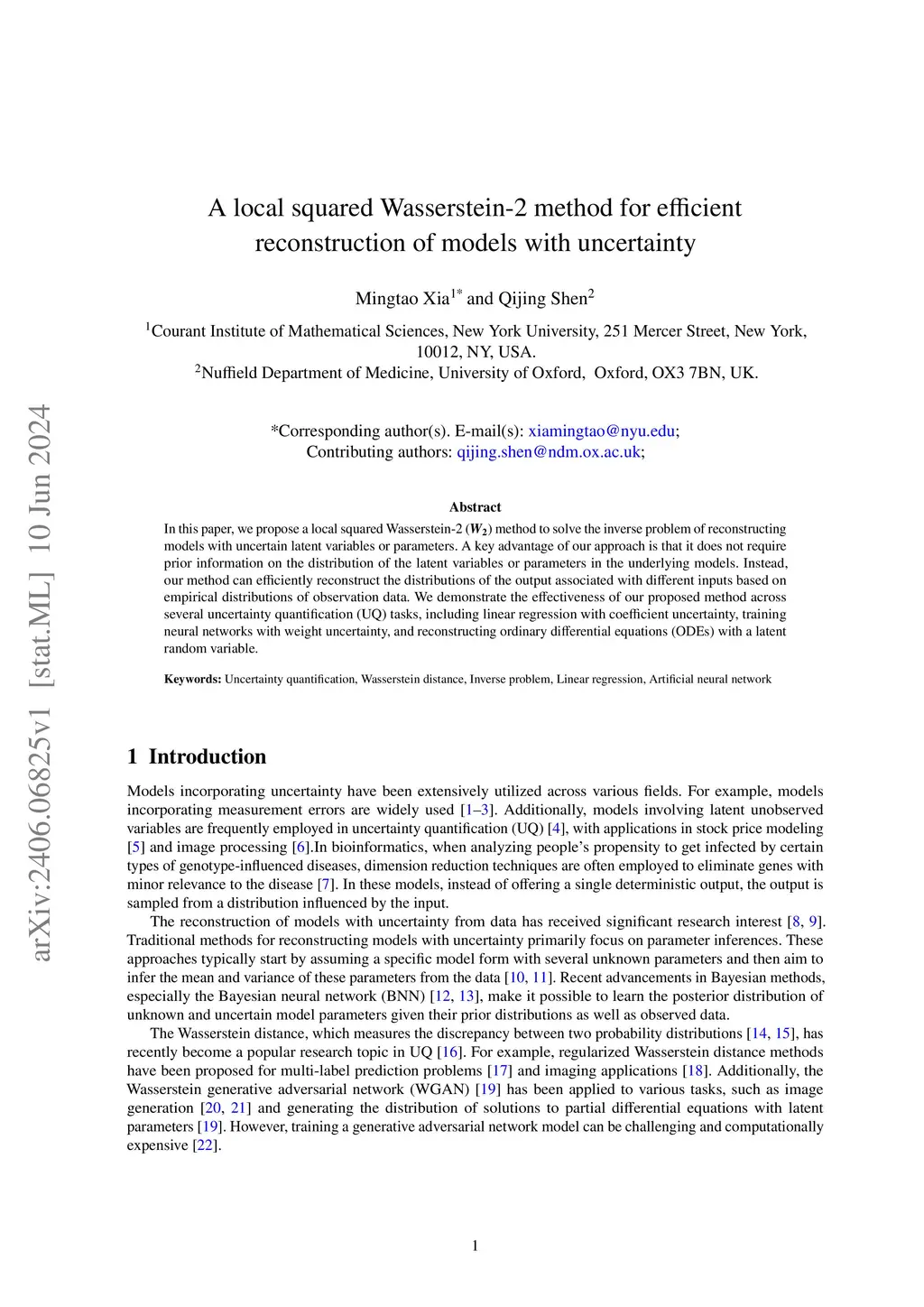 In this paper, we propose a local squared Wasserstein-2 (W_2) method to solve the inverse problem of reconstructing models with uncertain latent variables or parameters. A key advantage of our approach is that it does not require prior information on the distribution of the latent variables or parameters in the underlying models. Instead, our method can efficiently reconstruct the distributions of the output associated with different inputs based on empirical distributions of observation data. We demonstrate the effectiveness of our proposed method across several uncertainty quantification (UQ) tasks, including linear regression with coefficient uncertainty, training neural networks with weight uncertainty, and reconstructing ordinary differential equations (ODEs) with a latent random variable.