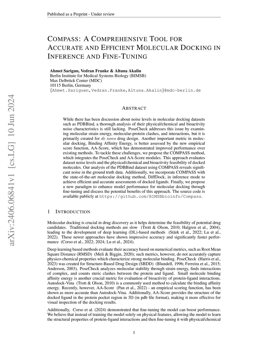While there has been discussion about noise levels in molecular docking datasets such as PDBBind, a thorough analysis of their physical/chemical and bioactivity noise characteristics is still lacking. PoseCheck addresses this issue by examining molecular strain energy, molecular-protein clashes, and interactions, but it is primarily created for drug design. Another important metric in molecular docking, Binding Affinity Energy, is better assessed by the new empirical score function, AA-Score, which has demonstrated improved performance over existing methods. To tackle these challenges, we propose the COMPASS method, which integrates the PoseCheck and AA-Score modules. This approach evaluates dataset noise levels and the physical/chemical and bioactivity feasibility of docked molecules. Our analysis of the PDBBind dataset using COMPASS reveals significant noise in the ground truth data. Additionally, we incorporate COMPASS with the state-of-the-art molecular docking method, DiffDock, in inference mode to achieve efficient and accurate assessments of docked ligands. Finally, we propose a new paradigm to enhance model performance for molecular docking through fine-tuning and discuss the potential benefits of this approach. The source code is available publicly at https://github.com/BIMSBbioinfo/Compass.