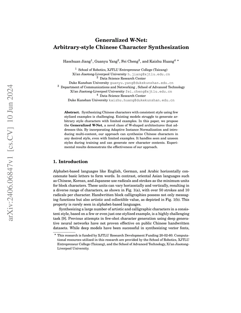 Generalized W-Net: Arbitrary-style Chinese Character Synthesization