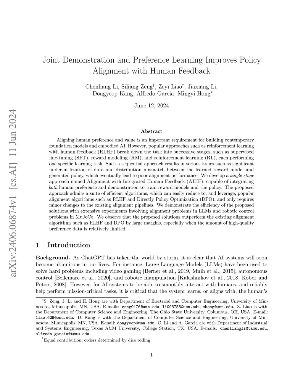 Aligning human preference and value is an important requirement for building contemporary foundation models and embodied AI. However, popular approaches such as reinforcement learning with human feedback (RLHF) break down the task into successive stages, such as supervised fine-tuning (SFT), reward modeling (RM), and reinforcement learning (RL), each performing one specific learning task. Such a sequential approach results in serious issues such as significant under-utilization of data and distribution mismatch between the learned reward model and generated policy, which eventually lead to poor alignment performance. We develop a single stage approach named Alignment with Integrated Human Feedback (AIHF), capable of integrating both human preference and demonstration to train reward models and the policy. The proposed approach admits a suite of efficient algorithms, which can easily reduce to, and leverage, popular alignment algorithms such as RLHF and Directly Policy Optimization (DPO), and only requires minor changes to the existing alignment pipelines. We demonstrate the efficiency of the proposed solutions with extensive experiments involving alignment problems in LLMs and robotic control problems in MuJoCo. We observe that the proposed solutions outperform the existing alignment algorithms such as RLHF and DPO by large margins, especially when the amount of high-quality preference data is relatively limited.