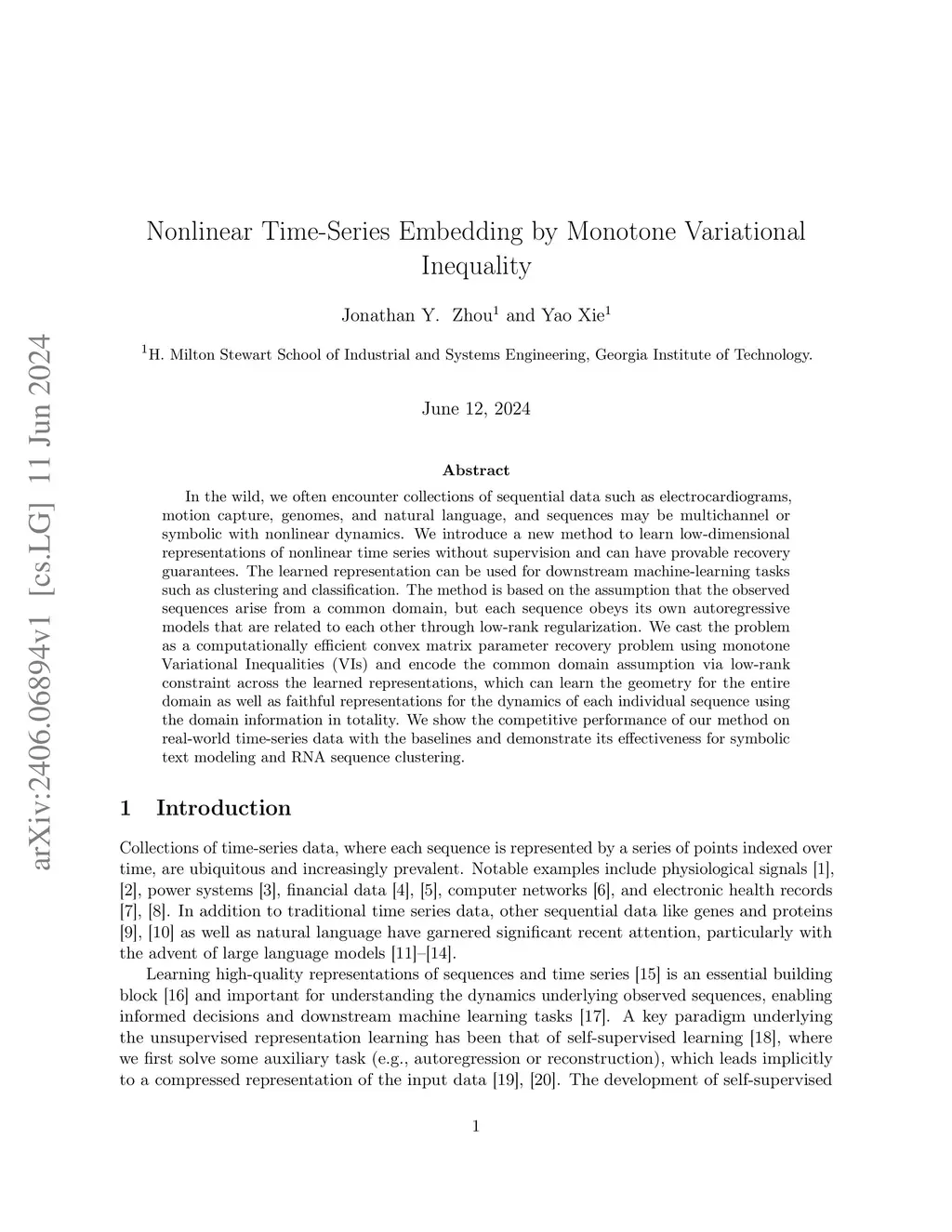 In the wild, we often encounter collections of sequential data such as electrocardiograms, motion capture, genomes, and natural language, and sequences may be multichannel or symbolic with nonlinear dynamics. We introduce a new method to learn low-dimensional representations of nonlinear time series without supervision and can have provable recovery guarantees. The learned representation can be used for downstream machine-learning tasks such as clustering and classification. The method is based on the assumption that the observed sequences arise from a common domain, but each sequence obeys its own autoregressive models that are related to each other through low-rank regularization. We cast the problem as a computationally efficient convex matrix parameter recovery problem using monotone Variational Inequality and encode the common domain assumption via low-rank constraint across the learned representations, which can learn the geometry for the entire domain as well as faithful representations for the dynamics of each individual sequence using the domain information in totality. We show the competitive performance of our method on real-world time-series data with the baselines and demonstrate its effectiveness for symbolic text modeling and RNA sequence clustering.
