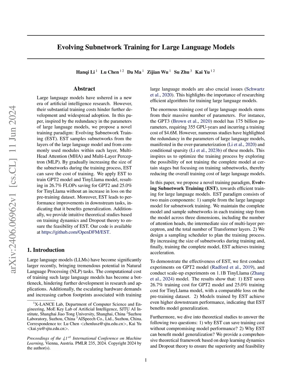 Large language models have ushered in a new era of artificial intelligence research. However, their substantial training costs hinder further development and widespread adoption. In this paper, inspired by the redundancy in the parameters of large language models, we propose a novel training paradigm: Evolving Subnetwork Training (EST). EST samples subnetworks from the layers of the large language model and from commonly used modules within each layer, Multi-Head Attention (MHA) and Multi-Layer Perceptron (MLP). By gradually increasing the size of the subnetworks during the training process, EST can save the cost of training. We apply EST to train GPT2 model and TinyLlama model, resulting in 26.7\% FLOPs saving for GPT2 and 25.0\% for TinyLlama without an increase in loss on the pre-training dataset. Moreover, EST leads to performance improvements in downstream tasks, indicating that it benefits generalization. Additionally, we provide intuitive theoretical studies based on training dynamics and Dropout theory to ensure the feasibility of EST. Our code is available at https://github.com/OpenDFM/EST.