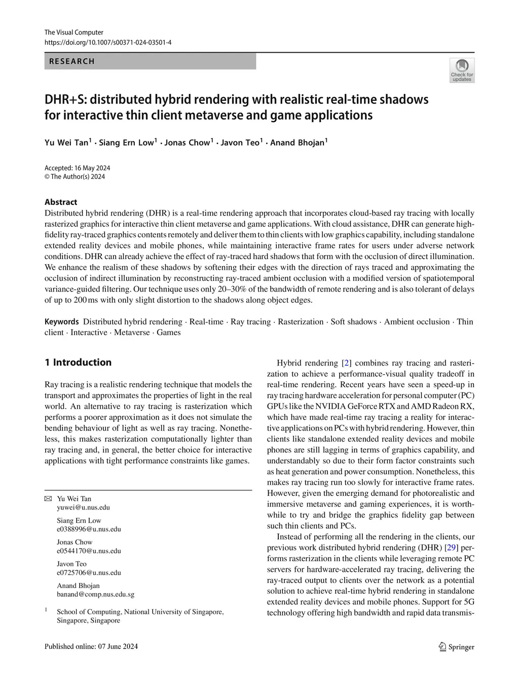 Distributed hybrid rendering (DHR) is a real-time rendering approach that incorporates cloud-based ray tracing with locally rasterized graphics for interactive thin client metaverse and game applications. With cloud assistance, DHR can generate high-fidelity ray-traced graphics contents remotely and deliver them to thin clients with low graphics capability, including standalone extended reality devices and mobile phones, while maintaining interactive frame rates for users under adverse network conditions. DHR can already achieve the effect of ray-traced hard shadows that form with the occlusion of direct illumination. We enhance the realism of these shadows by softening their edges with the direction of rays traced and approximating the occlusion of indirect illumination by reconstructing ray-traced ambient occlusion with a modified version of spatiotemporal variance-guided filtering. Our technique uses only 20-30% of the bandwidth of remote rendering and is also tolerant of delays of up to 200 ms with only slight distortion to the shadows along object edges.