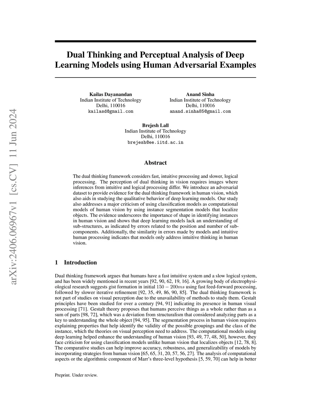 The dual thinking framework considers fast, intuitive, and slower logical processing. The perception of dual thinking in vision requires images where inferences from intuitive and logical processing differ, and the latter is under-explored in current studies. We introduce a novel adversarial dataset to provide evidence for the dual thinking framework in human vision, which also facilitates the study of the qualitative behavior of deep learning models. Our psychophysical studies show the presence of multiple inferences in rapid succession, and analysis of errors shows that the early stopping of visual processing can result in missing relevant information. MLLMs (Multi-modal Large Language Models) and VLMs (Vision Language Models) have made significant progress in correcting errors in intuitive processing in human vision and showed enhanced performance on images requiring logical processing. However, their improvements in logical processing have not kept pace with their advancements in intuitive processing. In contrast, segmentation models exhibit errors similar to those seen in intuitive human processing and lack understanding of sub-structures, as indicated by errors related to sub-components in identified instances. As AI (Artificial Intelligence)-based systems find increasing applications in safety-critical domains like autonomous driving, the integration of logical processing capabilities becomes essential. This not only enhances performance but also addresses the limitations of scaling-based approaches while ensuring robustness and reliability in real-world environments.