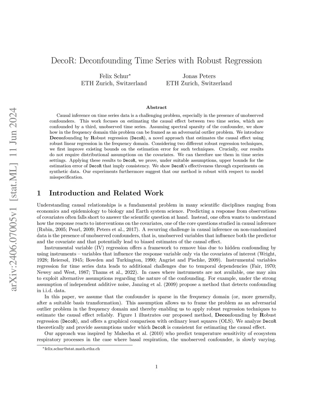 Causal inference on time series data is a challenging problem, especially in the presence of unobserved confounders. This work focuses on estimating the causal effect between two time series, which are confounded by a third, unobserved time series. Assuming spectral sparsity of the confounder, we show how in the frequency domain this problem can be framed as an adversarial outlier problem. We introduce Deconfounding by Robust regression (DecoR), a novel approach that estimates the causal effect using robust linear regression in the frequency domain. Considering two different robust regression techniques, we first improve existing bounds on the estimation error for such techniques. Crucially, our results do not require distributional assumptions on the covariates. We can therefore use them in time series settings. Applying these results to DecoR, we prove, under suitable assumptions, upper bounds for the estimation error of DecoR that imply consistency. We show DecoR's effectiveness through experiments on synthetic data. Our experiments furthermore suggest that our method is robust with respect to model misspecification.