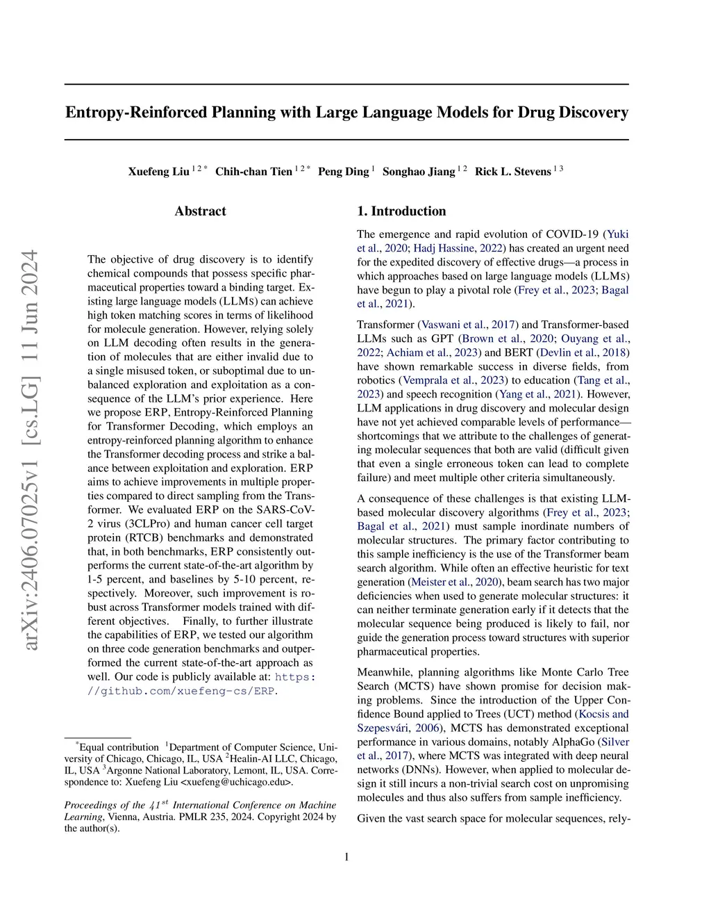 The objective of drug discovery is to identify chemical compounds that possess specific pharmaceutical properties toward a binding target. Existing large language models (LLMS) can achieve high token matching scores in terms of likelihood for molecule generation. However, relying solely on LLM decoding often results in the generation of molecules that are either invalid due to a single misused token, or suboptimal due to unbalanced exploration and exploitation as a consequence of the LLMs prior experience. Here we propose ERP, Entropy-Reinforced Planning for Transformer Decoding, which employs an entropy-reinforced planning algorithm to enhance the Transformer decoding process and strike a balance between exploitation and exploration. ERP aims to achieve improvements in multiple properties compared to direct sampling from the Transformer. We evaluated ERP on the SARS-CoV-2 virus (3CLPro) and human cancer cell target protein (RTCB) benchmarks and demonstrated that, in both benchmarks, ERP consistently outperforms the current state-of-the-art algorithm by 1-5 percent, and baselines by 5-10 percent, respectively. Moreover, such improvement is robust across Transformer models trained with different objectives. Finally, to further illustrate the capabilities of ERP, we tested our algorithm on three code generation benchmarks and outperformed the current state-of-the-art approach as well. Our code is publicly available at:this https URL.