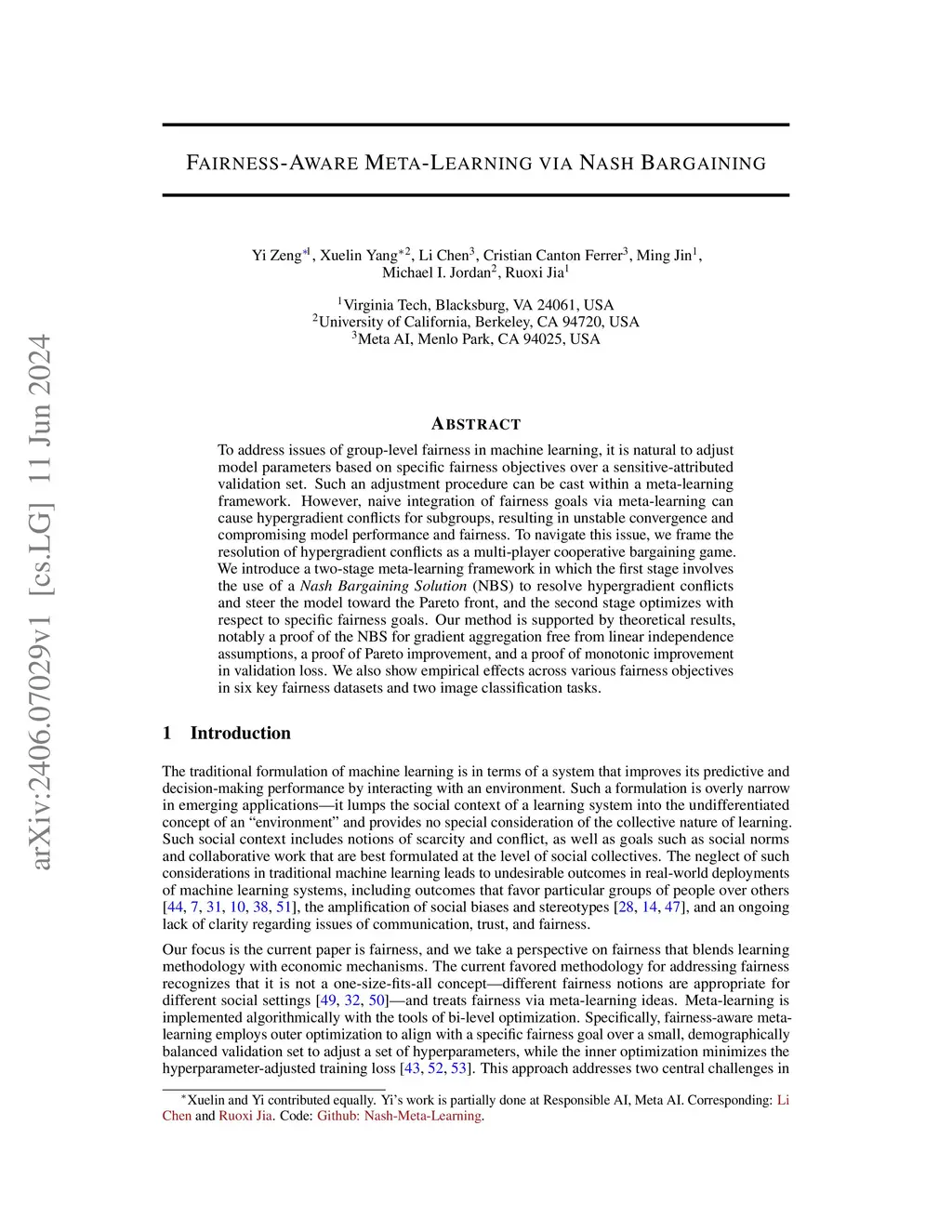 To address issues of group-level fairness in machine learning, it is natural to adjust model parameters based on specific fairness objectives over a sensitive-attributed validation set. Such an adjustment procedure can be cast within a meta-learning framework. However, naive integration of fairness goals via meta-learning can cause hypergradient conflicts for subgroups, resulting in unstable convergence and compromising model performance and fairness. To navigate this issue, we frame the resolution of hypergradient conflicts as a multi-player cooperative bargaining game. We introduce a two-stage meta-learning framework in which the first stage involves the use of a Nash Bargaining Solution (NBS) to resolve hypergradient conflicts and steer the model toward the Pareto front, and the second stage optimizes with respect to specific fairness goals. Our method is supported by theoretical results, notably a proof of the NBS for gradient aggregation free from linear independence assumptions, a proof of Pareto improvement, and a proof of monotonic improvement in validation loss. We also show empirical effects across various fairness objectives in six key fairness datasets and two image classification tasks.