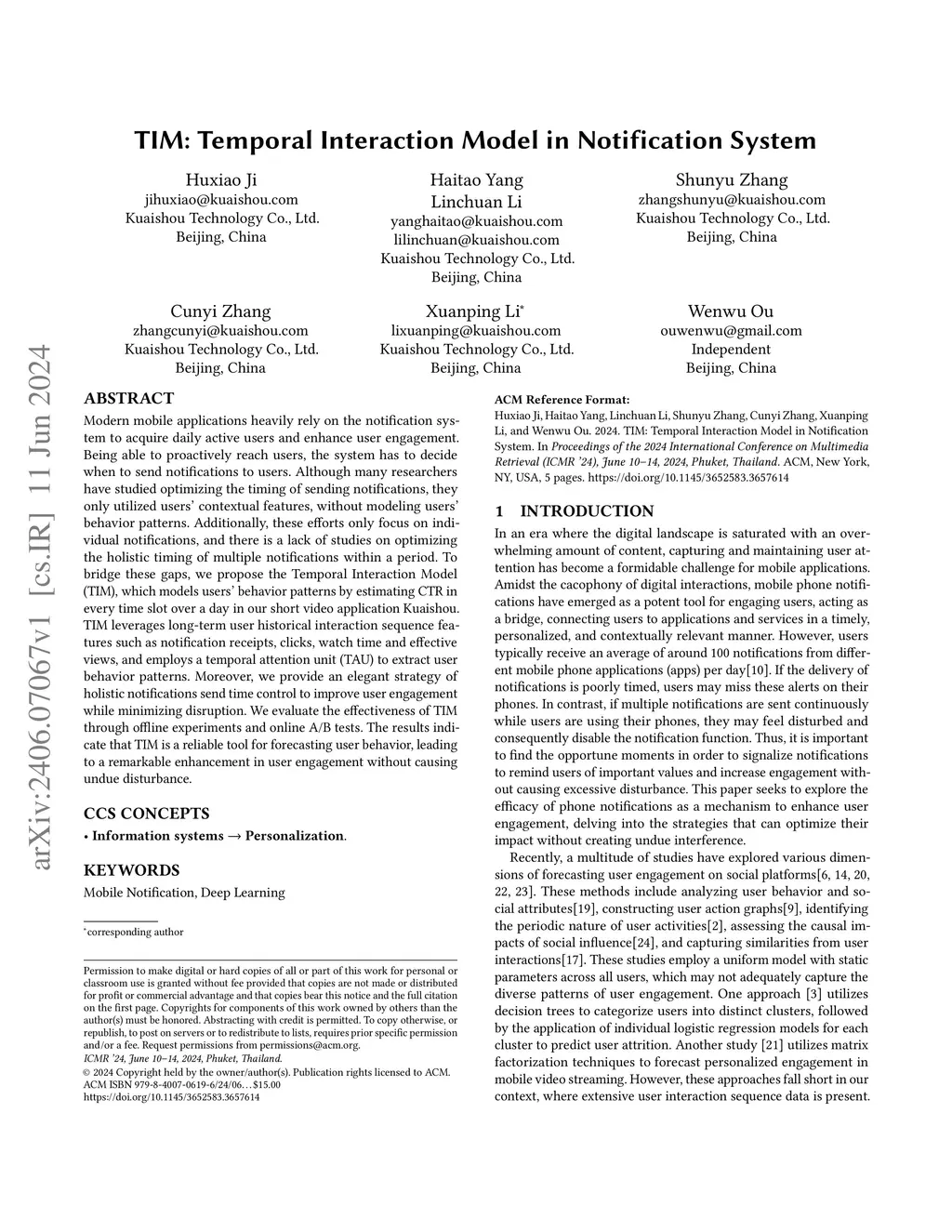 Modern mobile applications heavily rely on the notification system to acquire daily active users and enhance user engagement. Being able to proactively reach users, the system has to decide when to send notifications to users. Although many researchers have studied optimizing the timing of sending notifications, they only utilized users' contextual features, without modeling users' behavior patterns. Additionally, these efforts only focus on individual notifications, and there is a lack of studies on optimizing the holistic timing of multiple notifications within a period. To bridge these gaps, we propose the Temporal Interaction Model (TIM), which models users' behavior patterns by estimating CTR in every time slot over a day in our short video application Kuaishou. TIM leverages long-term user historical interaction sequence features such as notification receipts, clicks, watch time and effective views, and employs a temporal attention unit (TAU) to extract user behavior patterns. Moreover, we provide an elegant strategy of holistic notifications send time control to improve user engagement while minimizing disruption. We evaluate the effectiveness of TIM through offline experiments and online A/B tests. The results indicate that TIM is a reliable tool for forecasting user behavior, leading to a remarkable enhancement in user engagement without causing undue disturbance.