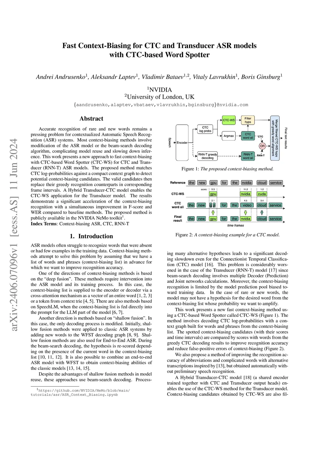 Accurate recognition of rare and new words remains a pressing problem for contextualized Automatic Speech Recognition (ASR) systems. Most context-biasing methods involve modification of the ASR model or the beam-search decoding algorithm, complicating model reuse and slowing down inference. This work presents a new approach to fast context-biasing with CTC-based Word Spotter (CTC-WS) for CTC and Transducer (RNN-T) ASR models. The proposed method matches CTC log-probabilities against a compact context graph to detect potential context-biasing candidates. The valid candidates then replace their greedy recognition counterparts in corresponding frame intervals. A Hybrid Transducer-CTC model enables the CTC-WS application for the Transducer model. The results demonstrate a significant acceleration of the context-biasing recognition with a simultaneous improvement in F-score and WER compared to baseline methods. The proposed method is publicly available in the NVIDIA NeMo toolkit.