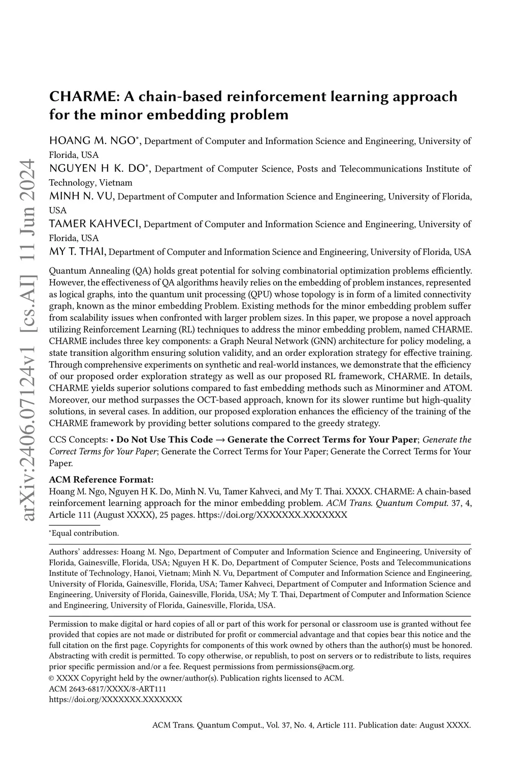 Quantum annealing (QA) has great potential to solve combinatorial optimization problems efficiently. However, the effectiveness of QA algorithms is heavily based on the embedding of problem instances, represented as logical graphs, into the quantum processing unit (QPU) whose topology is in the form of a limited connectivity graph, known as the minor embedding problem. Because the minor embedding problem is an NP-hard problem~\mbox{\cite{Goodrich2018}}, existing methods for the minor embedding problem suffer from scalability issues when faced with larger problem sizes. In this paper, we propose a novel approach utilizing Reinforcement Learning (RL) techniques to address the minor embedding problem, named CHARME. CHARME includes three key components: a Graph Neural Network (GNN) architecture for policy modeling, a state transition algorithm that ensures solution validity, and an order exploration strategy for effective training. Through comprehensive experiments on synthetic and real-world instances, we demonstrate the efficiency of our proposed order exploration strategy as well as our proposed RL framework, CHARME. In particular, CHARME yields superior solutions in terms of qubit usage compared to fast embedding methods such as Minorminer and ATOM. Moreover, our method surpasses the OCT-based approach, known for its slower runtime but high-quality solutions, in several cases. In addition, our proposed exploration enhances the efficiency of the training of the CHARME framework by providing better solutions compared to the greedy strategy.