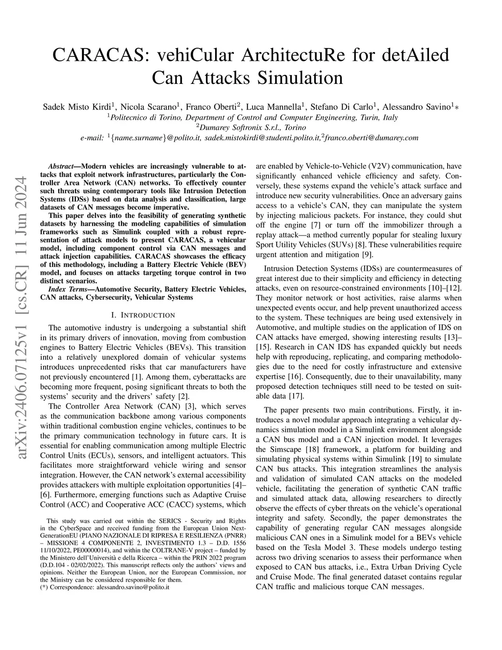 Modern vehicles are increasingly vulnerable to attacks that exploit network infrastructures, particularly the Controller Area Network (CAN) networks. To effectively counter such threats using contemporary tools like Intrusion Detection Systems (IDSs) based on data analysis and classification, large datasets of CAN messages become imperative. This paper delves into the feasibility of generating synthetic datasets by harnessing the modeling capabilities of simulation frameworks such as Simulink coupled with a robust representation of attack models to present CARACAS, a vehicular model, including component control via CAN messages and attack injection capabilities. CARACAS showcases the efficacy of this methodology, including a Battery Electric Vehicle (BEV) model, and focuses on attacks targeting torque control in two distinct scenarios.