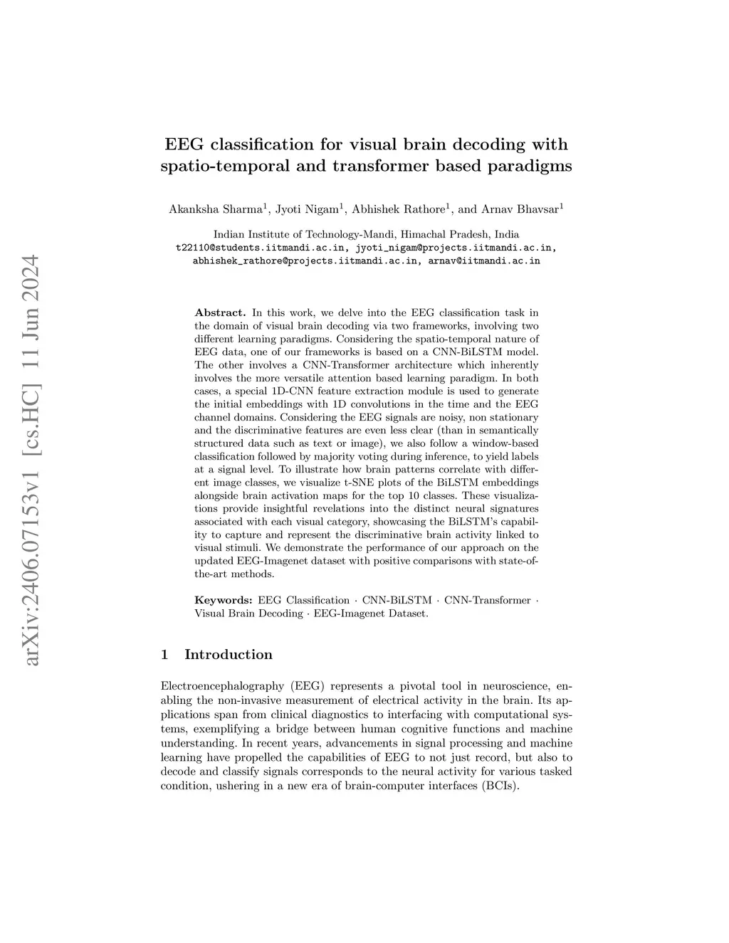 In this work, we delve into the EEG classification task in the domain of visual brain decoding via two frameworks, involving two different learning paradigms. Considering the spatio-temporal nature of EEG data, one of our frameworks is based on a CNN-BiLSTM model. The other involves a CNN-Transformer architecture which inherently involves the more versatile attention based learning paradigm. In both cases, a special 1D-CNN feature extraction module is used to generate the initial embeddings with 1D convolutions in the time and the EEG channel domains. Considering the EEG signals are noisy, non stationary and the discriminative features are even less clear (than in semantically structured data such as text or image), we also follow a window-based classification followed by majority voting during inference, to yield labels at a signal level. To illustrate how brain patterns correlate with different image classes, we visualize t-SNE plots of the BiLSTM embeddings alongside brain activation maps for the top 10 classes. These visualizations provide insightful revelations into the distinct neural signatures associated with each visual category, showcasing the BiLSTM's capability to capture and represent the discriminative brain activity linked to visual stimuli. We demonstrate the performance of our approach on the updated EEG-Imagenet dataset with positive comparisons with state-of-the-art methods.