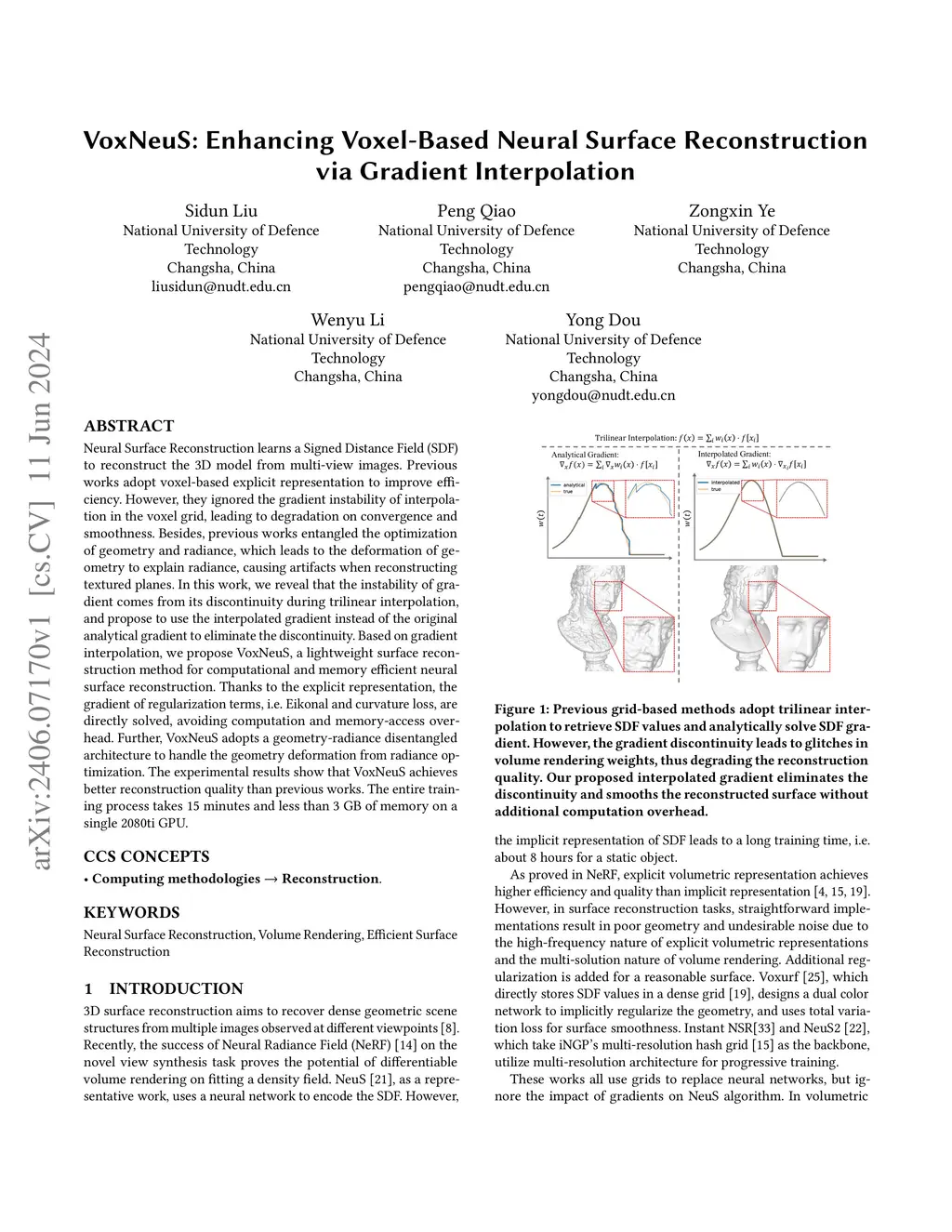 Neural Surface Reconstruction learns a Signed Distance Field~(SDF) to reconstruct the 3D model from multi-view images. Previous works adopt voxel-based explicit representation to improve efficiency. However, they ignored the gradient instability of interpolation in the voxel grid, leading to degradation on convergence and smoothness. Besides, previous works entangled the optimization of geometry and radiance, which leads to the deformation of geometry to explain radiance, causing artifacts when reconstructing textured planes. In this work, we reveal that the instability of gradient comes from its discontinuity during trilinear interpolation, and propose to use the interpolated gradient instead of the original analytical gradient to eliminate the discontinuity. Based on gradient interpolation, we propose VoxNeuS, a lightweight surface reconstruction method for computational and memory efficient neural surface reconstruction. Thanks to the explicit representation, the gradient of regularization terms, i.e. Eikonal and curvature loss, are directly solved, avoiding computation and memory-access overhead. Further, VoxNeuS adopts a geometry-radiance disentangled architecture to handle the geometry deformation from radiance optimization. The experimental results show that VoxNeuS achieves better reconstruction quality than previous works. The entire training process takes 15 minutes and less than 3 GB of memory on a single 2080ti GPU.