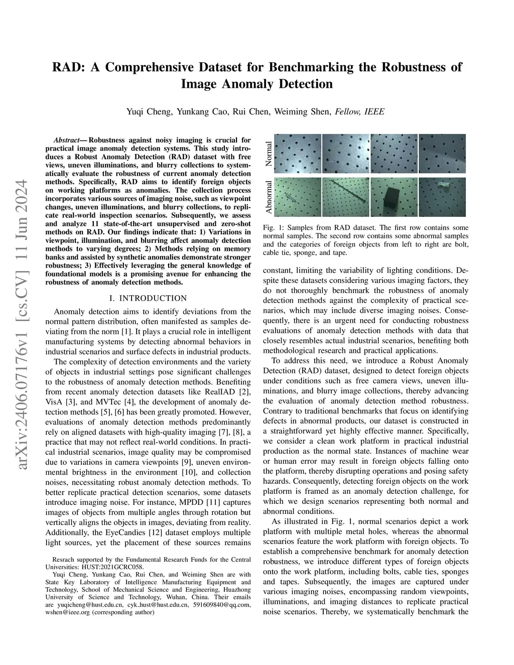 Robustness against noisy imaging is crucial for practical image anomaly detection systems. This study introduces a Robust Anomaly Detection (RAD) dataset with free views, uneven illuminations, and blurry collections to systematically evaluate the robustness of current anomaly detection methods. Specifically, RAD aims to identify foreign objects on working platforms as anomalies. The collection process incorporates various sources of imaging noise, such as viewpoint changes, uneven illuminations, and blurry collections, to replicate real-world inspection scenarios. Subsequently, we assess and analyze 11 state-of-the-art unsupervised and zero-shot methods on RAD. Our findings indicate that: 1) Variations in viewpoint, illumination, and blurring affect anomaly detection methods to varying degrees; 2) Methods relying on memory banks and assisted by synthetic anomalies demonstrate stronger robustness; 3) Effectively leveraging the general knowledge of foundational models is a promising avenue for enhancing the robustness of anomaly detection methods. The dataset is available at https://github.com/hustCYQ/RAD-dataset.