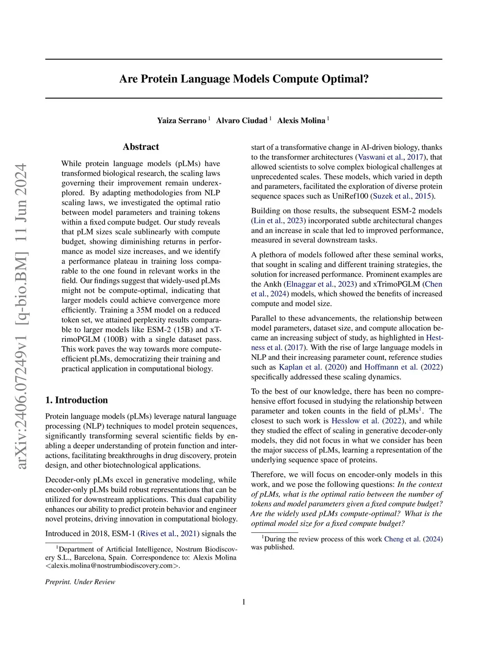 While protein language models (pLMs) have transformed biological research, the scaling laws governing their improvement remain underexplored. By adapting methodologies from NLP scaling laws, we investigated the optimal ratio between model parameters and training tokens within a fixed compute budget. Our study reveals that pLM sizes scale sublinearly with compute budget, showing diminishing returns in performance as model size increases, and we identify a performance plateau in training loss comparable to the one found in relevant works in the field. Our findings suggest that widely-used pLMs might not be compute-optimal, indicating that larger models could achieve convergence more efficiently. Training a 35M model on a reduced token set, we attained perplexity results comparable to larger models like ESM-2 (15B) and xTrimoPGLM (100B) with a single dataset pass. This work paves the way towards more compute-efficient pLMs, democratizing their training and practical application in computational biology.