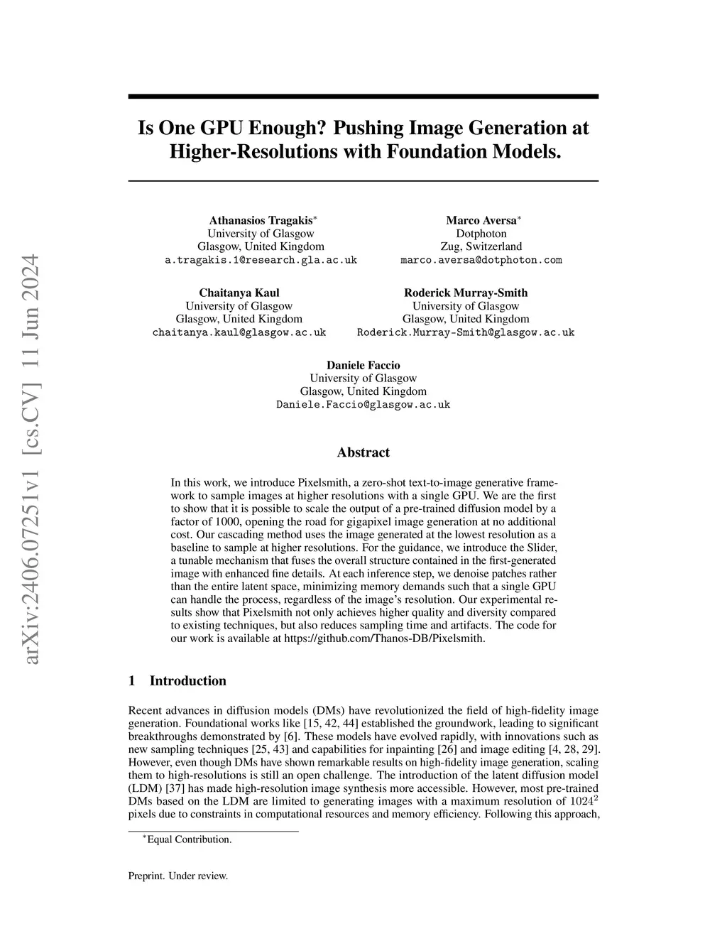 In this work, we introduce Pixelsmith, a zero-shot text-to-image generative framework to sample images at higher resolutions with a single GPU. We are the first to show that it is possible to scale the output of a pre-trained diffusion model by a factor of 1000, opening the road for gigapixel image generation at no additional cost. Our cascading method uses the image generated at the lowest resolution as a baseline to sample at higher resolutions. For the guidance, we introduce the Slider, a tunable mechanism that fuses the overall structure contained in the first-generated image with enhanced fine details. At each inference step, we denoise patches rather than the entire latent space, minimizing memory demands such that a single GPU can handle the process, regardless of the image's resolution. Our experimental results show that Pixelsmith not only achieves higher quality and diversity compared to existing techniques, but also reduces sampling time and artifacts. The code for our work is available at https://github.com/Thanos-DB/Pixelsmith.