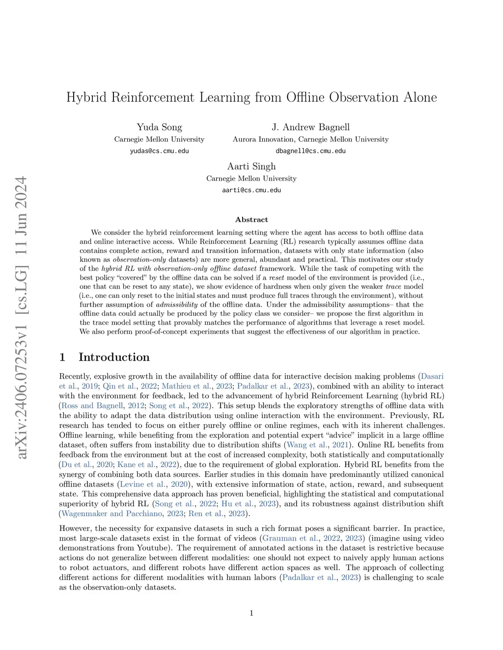 Hybrid Reinforcement Learning from Offline Observation Alone