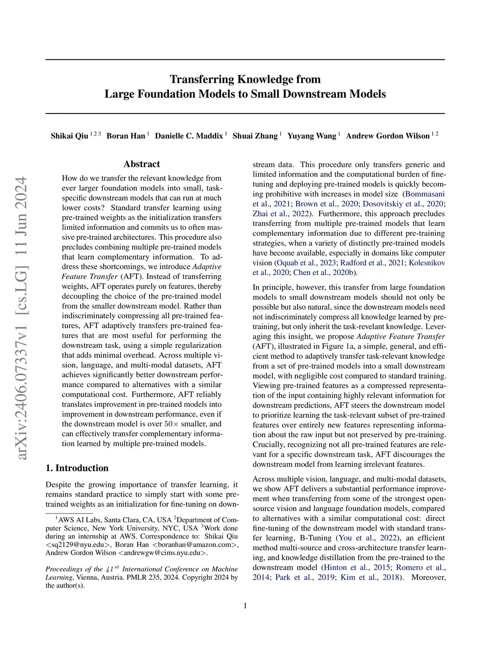 How do we transfer the relevant knowledge from ever larger foundation models into small, task-specific downstream models that can run at much lower costs? Standard transfer learning using pre-trained weights as the initialization transfers limited information and commits us to often massive pre-trained architectures. This procedure also precludes combining multiple pre-trained models that learn complementary information. To address these shortcomings, we introduce Adaptive Feature Transfer (AFT). Instead of transferring weights, AFT operates purely on features, thereby decoupling the choice of the pre-trained model from the smaller downstream model. Rather than indiscriminately compressing all pre-trained features, AFT adaptively transfers pre-trained features that are most useful for performing the downstream task, using a simple regularization that adds minimal overhead. Across multiple vision, language, and multi-modal datasets, AFT achieves significantly better downstream performance compared to alternatives with a similar computational cost. Furthermore, AFT reliably translates improvement in pre-trained models into improvement in downstream performance, even if the downstream model is over smaller, and can effectively transfer complementary information learned by multiple pre-trained models.