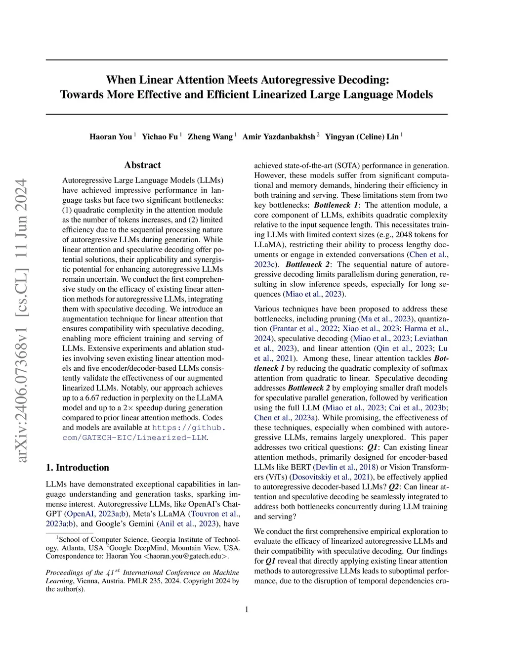 Autoregressive Large Language Models (LLMs) have achieved impressive performance in language tasks but face two significant bottlenecks: (1) quadratic complexity in the attention module as the number of tokens increases, and (2) limited efficiency due to the sequential processing nature of autoregressive LLMs during generation. While linear attention and speculative decoding offer potential solutions, their applicability and synergistic potential for enhancing autoregressive LLMs remain uncertain. We conduct the first comprehensive study on the efficacy of existing linear attention methods for autoregressive LLMs, integrating them with speculative decoding. We introduce an augmentation technique for linear attention that ensures compatibility with speculative decoding, enabling more efficient training and serving of LLMs. Extensive experiments and ablation studies involving seven existing linear attention models and five encoder/decoder-based LLMs consistently validate the effectiveness of our augmented linearized LLMs. Notably, our approach achieves up to a 6.67 reduction in perplexity on the LLaMA model and up to a 2 speedup during generation compared to prior linear attention methods. Codes and models are available at https://github.com/GATECH-EIC/Linearized-LLM.