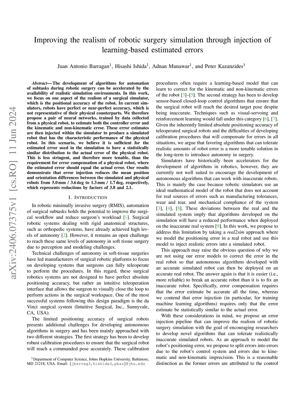 The development of algorithms for automation of subtasks during robotic surgery can be accelerated by the availability of realistic simulation environments. In this work, we focus on one aspect of the realism of a surgical simulator, which is the positional accuracy of the robot. In current simulators, robots have perfect or near-perfect accuracy, which is not representative of their physical counterparts. We therefore propose a pair of neural networks, trained by data collected from a physical robot, to estimate both the controller error and the kinematic and non-kinematic error. These error estimates are then injected within the simulator to produce a simulated robot that has the characteristic performance of the physical robot. In this scenario, we believe it is sufficient for the estimated error used in the simulation to have a statistically similar distribution to the actual error of the physical robot. This is less stringent, and therefore more tenable, than the requirement for error compensation of a physical robot, where the estimated error should equal the actual error. Our results demonstrate that error injection reduces the mean position and orientation differences between the simulated and physical robots from 5.0 mm / 3.6 deg to 1.3 mm / 1.7 deg, respectively, which represents reductions by factors of 3.8 and 2.1.