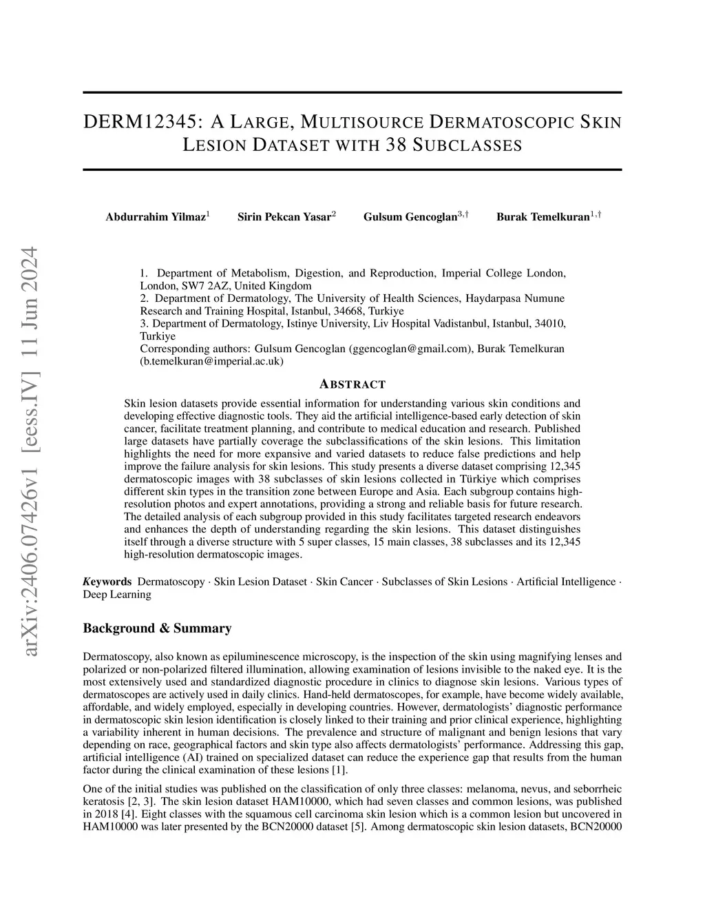 Skin lesion datasets provide essential information for understanding various skin conditions and developing effective diagnostic tools. They aid the artificial intelligence-based early detection of skin cancer, facilitate treatment planning, and contribute to medical education and research. Published large datasets have partially coverage the subclassifications of the skin lesions. This limitation highlights the need for more expansive and varied datasets to reduce false predictions and help improve the failure analysis for skin lesions. This study presents a diverse dataset comprising 12,345 dermatoscopic images with 38 subclasses of skin lesions collected in Turkiye which comprises different skin types in the transition zone between Europe and Asia. Each subgroup contains high-resolution photos and expert annotations, providing a strong and reliable basis for future research. The detailed analysis of each subgroup provided in this study facilitates targeted research endeavors and enhances the depth of understanding regarding the skin lesions. This dataset distinguishes itself through a diverse structure with 5 super classes, 15 main classes, 38 subclasses and its 12,345 high-resolution dermatoscopic images.