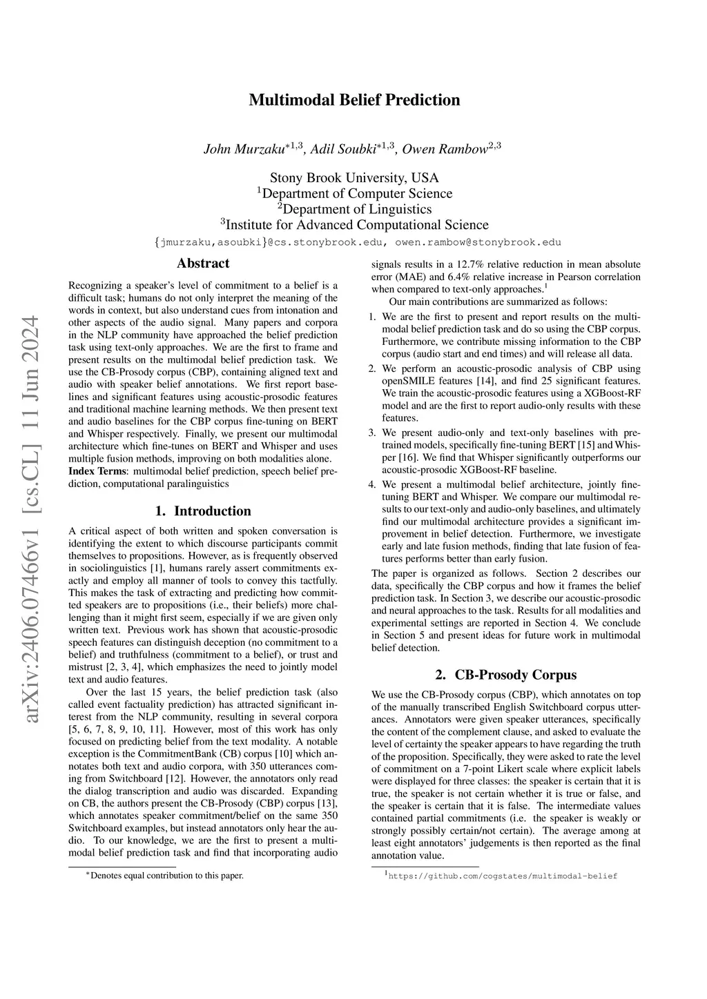 Recognizing a speaker's level of commitment to a belief is a difficult task; humans do not only interpret the meaning of the words in context, but also understand cues from intonation and other aspects of the audio signal. Many papers and corpora in the NLP community have approached the belief prediction task using text-only approaches. We are the first to frame and present results on the multimodal belief prediction task. We use the CB-Prosody corpus (CBP), containing aligned text and audio with speaker belief annotations. We first report baselines and significant features using acoustic-prosodic features and traditional machine learning methods. We then present text and audio baselines for the CBP corpus fine-tuning on BERT and Whisper respectively. Finally, we present our multimodal architecture which fine-tunes on BERT and Whisper and uses multiple fusion methods, improving on both modalities alone.