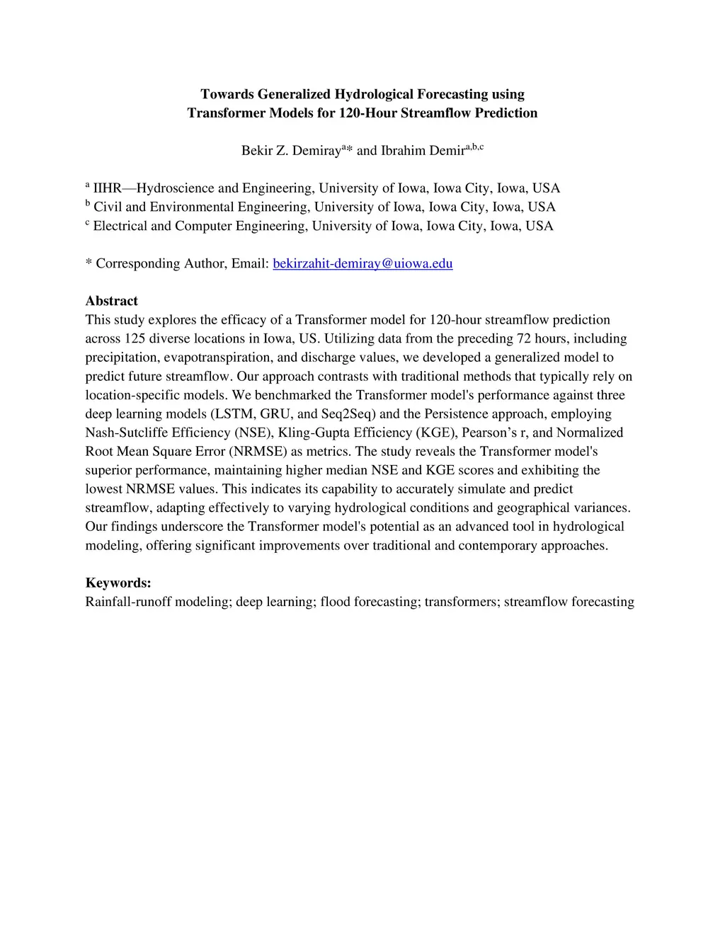 This study explores the efficacy of a Transformer model for 120-hour streamflow prediction across 125 diverse locations in Iowa, US. Utilizing data from the preceding 72 hours, including precipitation, evapotranspiration, and discharge values, we developed a generalized model to predict future streamflow. Our approach contrasts with traditional methods that typically rely on location-specific models. We benchmarked the Transformer model's performance against three deep learning models (LSTM, GRU, and Seq2Seq) and the Persistence approach, employing Nash-Sutcliffe Efficiency (NSE), Kling-Gupta Efficiency (KGE), Pearson's r, and Normalized Root Mean Square Error (NRMSE) as metrics. The study reveals the Transformer model's superior performance, maintaining higher median NSE and KGE scores and exhibiting the lowest NRMSE values. This indicates its capability to accurately simulate and predict streamflow, adapting effectively to varying hydrological conditions and geographical variances. Our findings underscore the Transformer model's potential as an advanced tool in hydrological modeling, offering significant improvements over traditional and contemporary approaches.