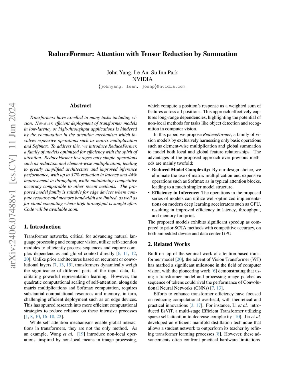 Transformers have excelled in many tasks including vision. However, efficient deployment of transformer models in low-latency or high-throughput applications is hindered by the computation in the attention mechanism which involves expensive operations such as matrix multiplication and Softmax. To address this, we introduce ReduceFormer, a family of models optimized for efficiency with the spirit of attention. ReduceFormer leverages only simple operations such as reduction and element-wise multiplication, leading to greatly simplified architecture and improved inference performance, with up to 37% reduction in latency and 44% improvement in throughput, while maintaining competitive accuracy comparable to other recent methods. The proposed model family is suitable for edge devices where compute resource and memory bandwidth are limited, as well as for cloud computing where high throughput is sought after.
