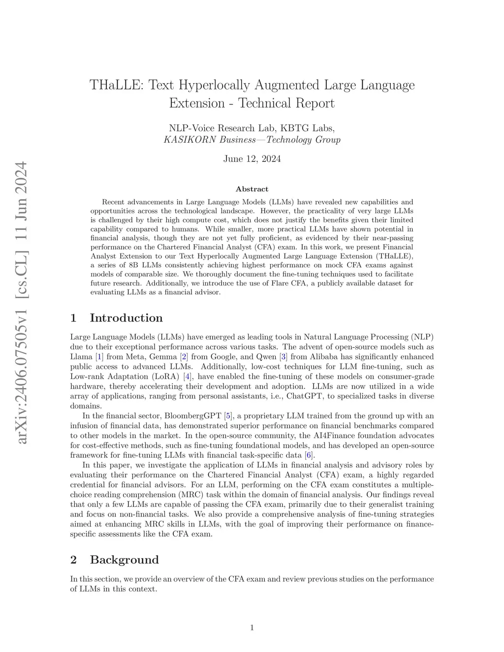 Recent advancements in Large Language Models (LLMs) have revealed new capabilities and opportunities across the technological landscape. However, the practicality of very large LLMs is challenged by their high compute cost, which does not justify the benefits given their limited capability compared to humans. While smaller, more practical LLMs have shown potential in financial analysis, though they are not yet fully proficient, as evidenced by their near-passing performance on the Chartered Financial Analyst (CFA) exam. In this work, we present Financial Analyst Extension to our Text Hyperlocally Augmented Large Language Extension (THaLLE), a series of 8B LLMs consistently achieving highest performance on mock CFA exams against models of comparable size. We thoroughly document the fine-tuning techniques used to facilitate future research. Additionally, we introduce the use of Flare CFA, a publicly available dataset for evaluating LLMs as a financial advisor.