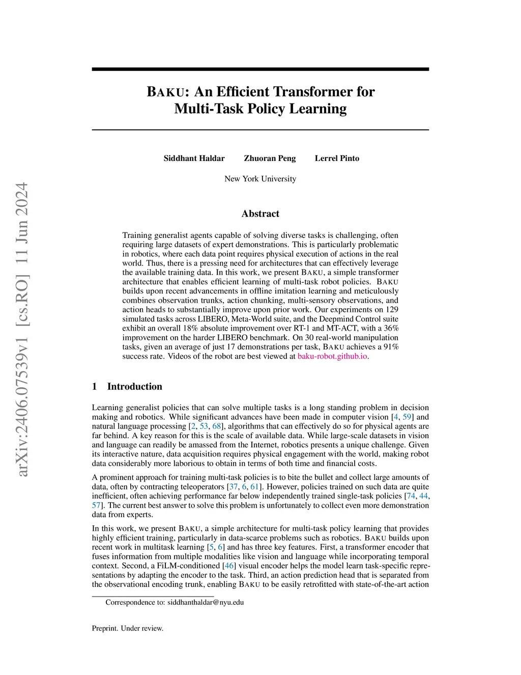 Training generalist agents capable of solving diverse tasks is challenging, often requiring large datasets of expert demonstrations. This is particularly problematic in robotics, where each data point requires physical execution of actions in the real world. Thus, there is a pressing need for architectures that can effectively leverage the available training data. In this work, we present BAKU, a simple transformer architecture that enables efficient learning of multi-task robot policies. BAKU builds upon recent advancements in offline imitation learning and meticulously combines observation trunks, action chunking, multi-sensory observations, and action heads to substantially improve upon prior work. Our experiments on 129 simulated tasks across LIBERO, Meta-World suite, and the Deepmind Control suite exhibit an overall 18% absolute improvement over RT-1 and MT-ACT, with a 36% improvement on the harder LIBERO benchmark. On 30 real-world manipulation tasks, given an average of just 17 demonstrations per task, BAKU achieves a 91% success rate. Videos of the robot are best viewed at https://baku-robot.github.io/.