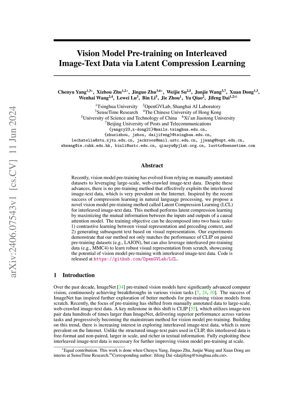 Recently, vision model pre-training has evolved from relying on manually annotated datasets to leveraging large-scale, web-crawled image-text data. Despite these advances, there is no pre-training method that effectively exploits the interleaved image-text data, which is very prevalent on the Internet. Inspired by the recent success of compression learning in natural language processing, we propose a novel vision model pre-training method called Latent Compression Learning (LCL) for interleaved image-text data. This method performs latent compression learning by maximizing the mutual information between the inputs and outputs of a causal attention model. The training objective can be decomposed into two basic tasks: 1) contrastive learning between visual representation and preceding context, and 2) generating subsequent text based on visual representation. Our experiments demonstrate that our method not only matches the performance of CLIP on paired pre-training datasets (e.g., LAION), but can also leverage interleaved pre-training data (e.g., MMC4) to learn robust visual representation from scratch, showcasing the potential of vision model pre-training with interleaved image-text data. Code is released at https://github.com/OpenGVLab/LCL.