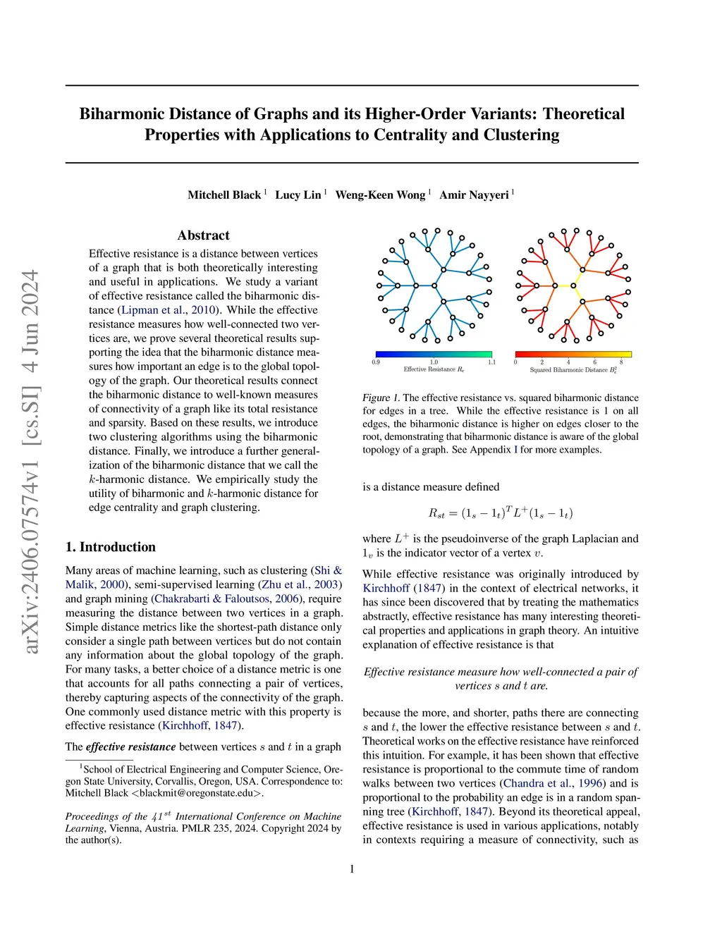 Effective resistance is a distance between vertices of a graph that is both theoretically interesting and useful in applications. We study a variant of effective resistance called the biharmonic distance. While the effective resistance measures how well-connected two vertices are, we prove several theoretical results supporting the idea that the biharmonic distance measures how important an edge is to the global topology of the graph. Our theoretical results connect the biharmonic distance to well-known measures of connectivity of a graph like its total resistance and sparsity. Based on these results, we introduce two clustering algorithms using the biharmonic distance. Finally, we introduce a further generalization of the biharmonic distance that we call the -harmonic distance. We empirically study the utility of biharmonic and -harmonic distance for edge centrality and graph clustering.