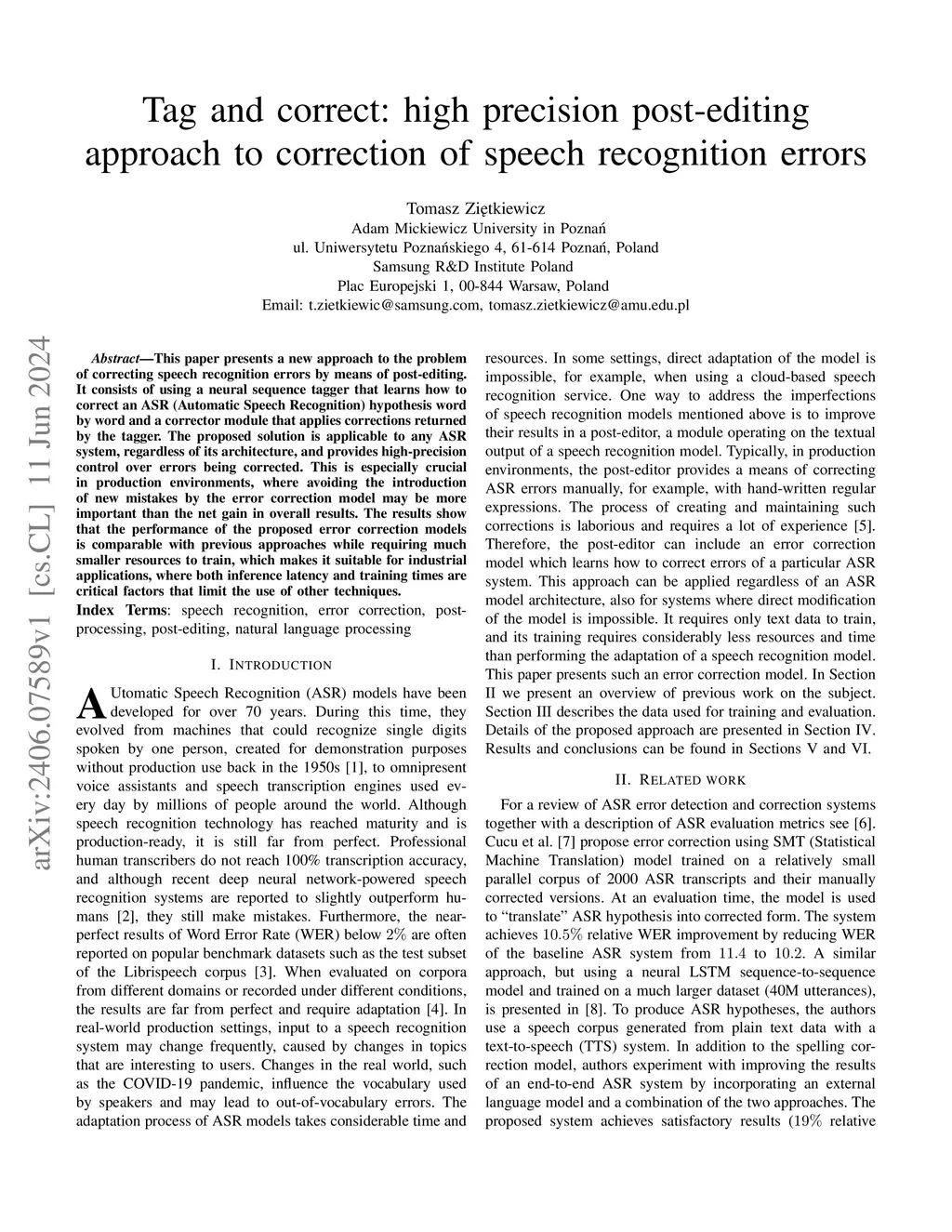 This paper presents a new approach to the problem of correcting speech recognition errors by means of post-editing. It consists of using a neural sequence tagger that learns how to correct an ASR (Automatic Speech Recognition) hypothesis word by word and a corrector module that applies corrections returned by the tagger. The proposed solution is applicable to any ASR system, regardless of its architecture, and provides high-precision control over errors being corrected. This is especially crucial in production environments, where avoiding the introduction of new mistakes by the error correction model may be more important than the net gain in overall results. The results show that the performance of the proposed error correction models is comparable with previous approaches while requiring much smaller resources to train, which makes it suitable for industrial applications, where both inference latency and training times are critical factors that limit the use of other techniques.