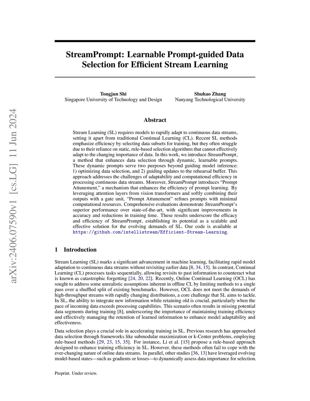 Stream Learning (SL) requires models that can quickly adapt to continuously evolving data, posing significant challenges in both computational efficiency and learning accuracy. Effective data selection is critical in SL to ensure a balance between information retention and training efficiency. Traditional rule-based data selection methods struggle to accommodate the dynamic nature of streaming data, highlighting the necessity for innovative solutions that effectively address these challenges. Recent approaches to handling changing data distributions face challenges that limit their effectiveness in fast-paced environments. In response, we propose StreamFP, a novel approach that uniquely employs dynamic, learnable parameters called fingerprints to enhance data selection efficiency and adaptability in stream learning. StreamFP optimizes coreset selection through its unique fingerprint-guided mechanism for efficient training while ensuring robust buffer updates that adaptively respond to data dynamics, setting it apart from existing methods in stream learning. Experimental results demonstrate that StreamFP outperforms state-of-the-art methods by achieving accuracy improvements of 15.99%, 29.65%, and 51.24% compared to baseline models across varying data arrival rates, alongside a training throughput increase of 4.6x.