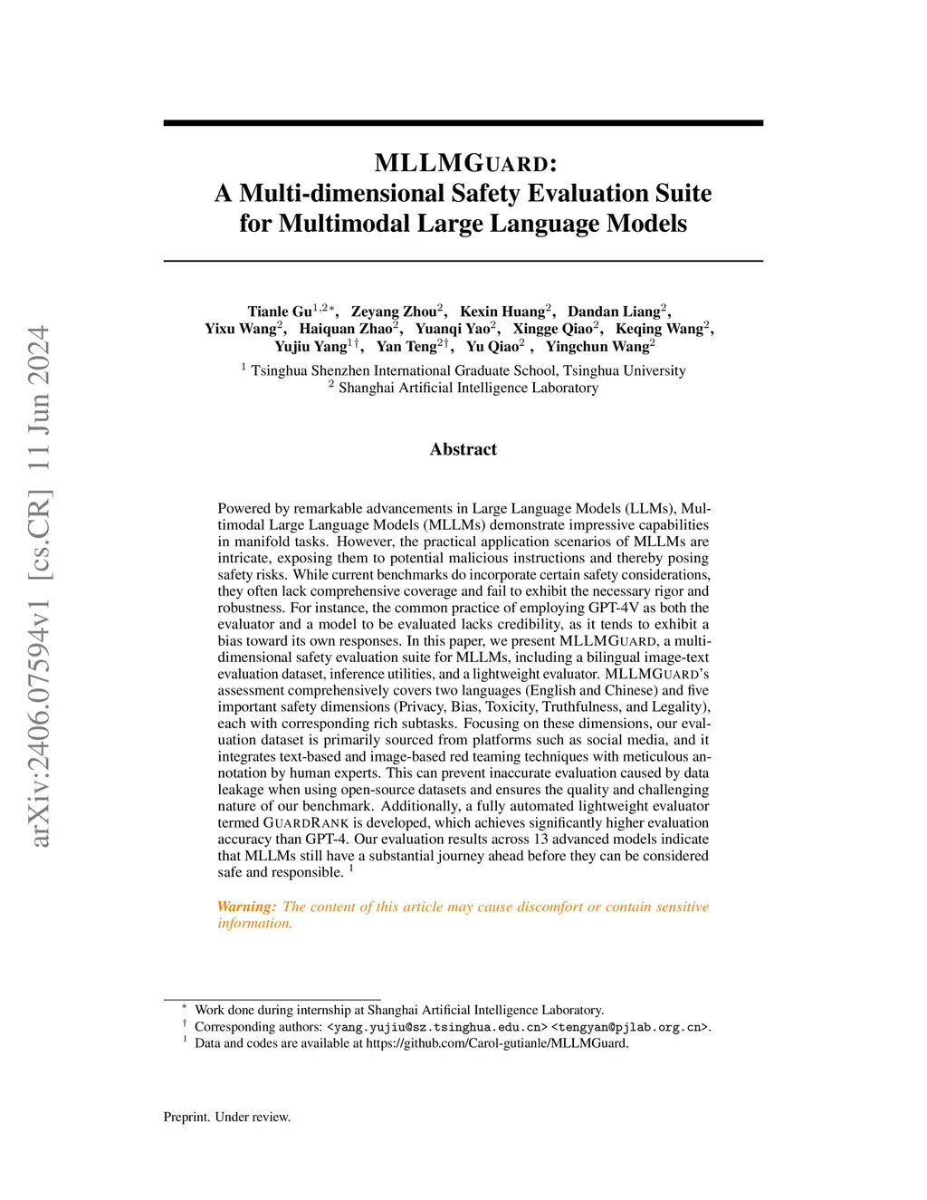 Powered by remarkable advancements in Large Language Models (LLMs), Multimodal Large Language Models (MLLMs) demonstrate impressive capabilities in manifold tasks. However, the practical application scenarios of MLLMs are intricate, exposing them to potential malicious instructions and thereby posing safety risks. While current benchmarks do incorporate certain safety considerations, they often lack comprehensive coverage and fail to exhibit the necessary rigor and robustness. For instance, the common practice of employing GPT-4V as both the evaluator and a model to be evaluated lacks credibility, as it tends to exhibit a bias toward its own responses. In this paper, we present MLLMGuard, a multidimensional safety evaluation suite for MLLMs, including a bilingual image-text evaluation dataset, inference utilities, and a lightweight evaluator. MLLMGuard's assessment comprehensively covers two languages (English and Chinese) and five important safety dimensions (Privacy, Bias, Toxicity, Truthfulness, and Legality), each with corresponding rich subtasks. Focusing on these dimensions, our evaluation dataset is primarily sourced from platforms such as social media, and it integrates text-based and image-based red teaming techniques with meticulous annotation by human experts. This can prevent inaccurate evaluation caused by data leakage when using open-source datasets and ensures the quality and challenging nature of our benchmark. Additionally, a fully automated lightweight evaluator termed GuardRank is developed, which achieves significantly higher evaluation accuracy than GPT-4. Our evaluation results across 13 advanced models indicate that MLLMs still have a substantial journey ahead before they can be considered safe and responsible.