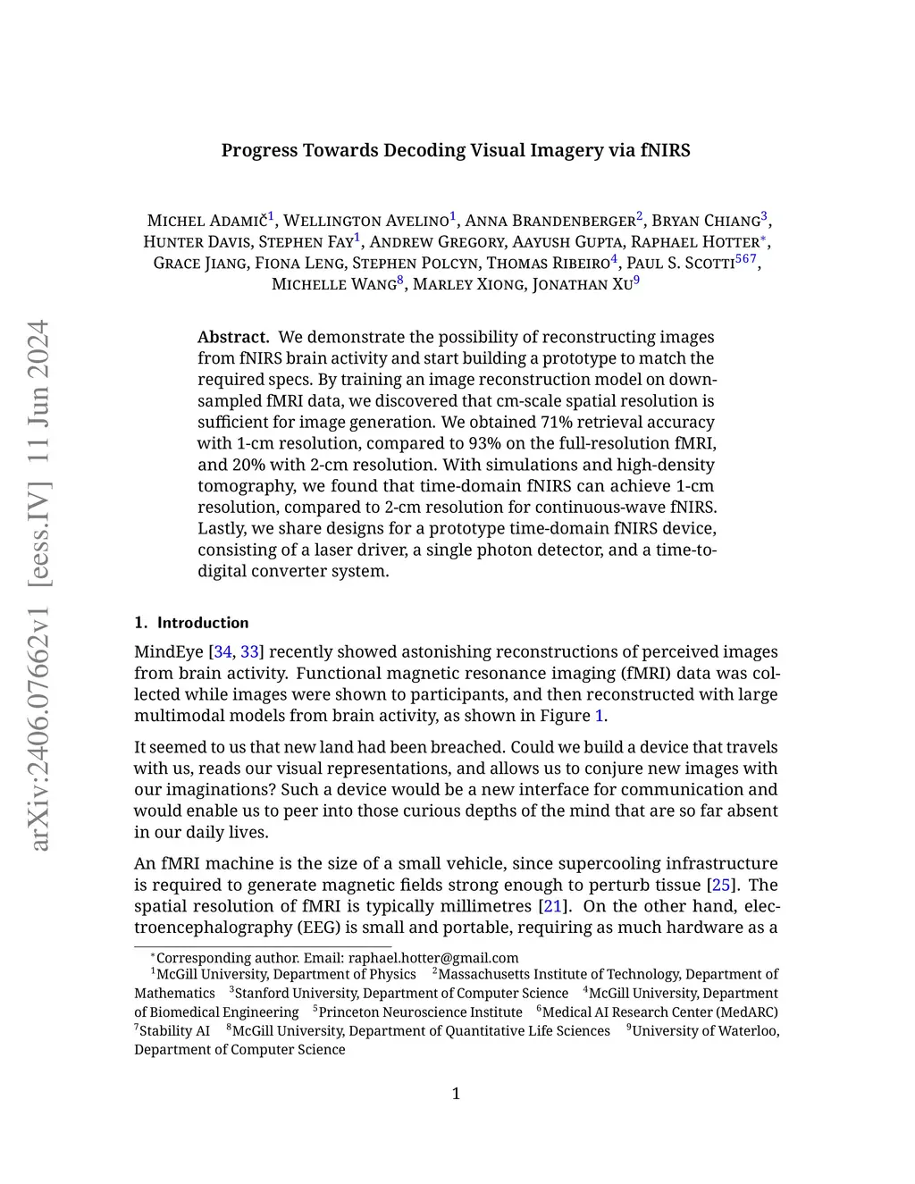 We demonstrate the possibility of reconstructing images from fNIRS brain activity and start building a prototype to match the required specs. By training an image reconstruction model on downsampled fMRI data, we discovered that cm-scale spatial resolution is sufficient for image generation. We obtained 71% retrieval accuracy with 1-cm resolution, compared to 93% on the full-resolution fMRI, and 20% with 2-cm resolution. With simulations and high-density tomography, we found that time-domain fNIRS can achieve 1-cm resolution, compared to 2-cm resolution for continuous-wave fNIRS. Lastly, we share designs for a prototype time-domain fNIRS device, consisting of a laser driver, a single photon detector, and a time-to-digital converter system.
