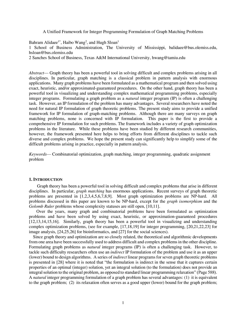 Graph theory has been a powerful tool in solving difficult and complex problems arising in all disciplines. In particular, graph matching is a classical problem in pattern analysis with enormous applications. Many graph problems have been formulated as a mathematical program and then solved using exact, heuristic, and/or approximated-guaranteed procedures. On the other hand, graph theory has been a powerful tool in visualizing and understanding complex mathematical programming problems, especially integer programs. Formulating a graph problem as a natural integer program (IP) is often a challenging task. However, an IP formulation of the problem has many advantages. Several researchers have noted the need for natural IP formulation of graph theoretic problems. The present study aims to provide a unified framework for IP formulation of graph-matching problems. Although there are many surveys on graph matching problems, none is concerned with IP formulation. This paper is the first to provide a comprehensive IP formulation for such problems. The framework includes a variety of graph optimization problems in the literature. While these problems have been studied by different research communities, however, the framework presented here helps to bring efforts from different disciplines to tackle such diverse and complex problems. We hope the present study can significantly help to simplify some of the difficult problems arising in practice, especially in pattern analysis.
