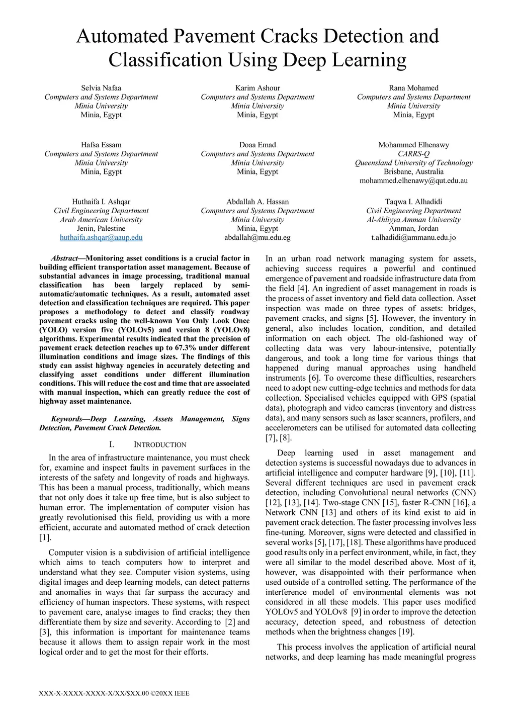 Monitoring asset conditions is a crucial factor in building efficient transportation asset management. Because of substantial advances in image processing, traditional manual classification has been largely replaced by semi-automatic/automatic techniques. As a result, automated asset detection and classification techniques are required. This paper proposes a methodology to detect and classify roadway pavement cracks using the well-known You Only Look Once (YOLO) version five (YOLOv5) and version 8 (YOLOv8) algorithms. Experimental results indicated that the precision of pavement crack detection reaches up to 67.3% under different illumination conditions and image sizes. The findings of this study can assist highway agencies in accurately detecting and classifying asset conditions under different illumination conditions. This will reduce the cost and time that are associated with manual inspection, which can greatly reduce the cost of highway asset maintenance.